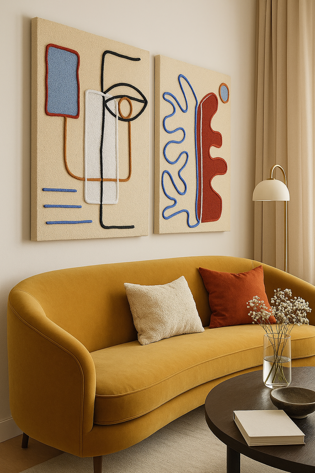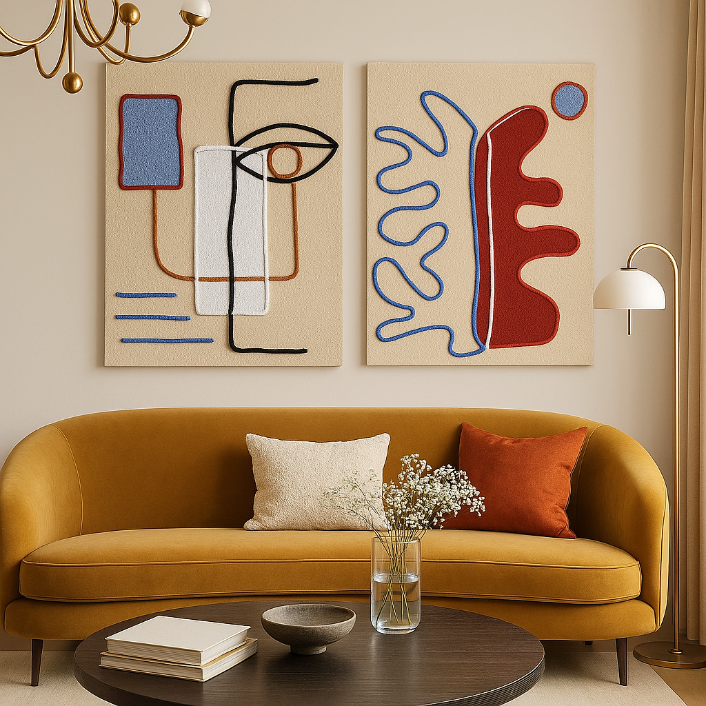 is a contemporary diptych that celebrates the harmony between structure and spontaneity. The two abstract compositions speak to one another through bold lines, textured surfaces, and warm earthy tones accented with vibrant blue and red. Together, they evoke a sense of balance and movement — where geometry meets emotion and simplicity meets depth — making them a striking statement for modern interiors.