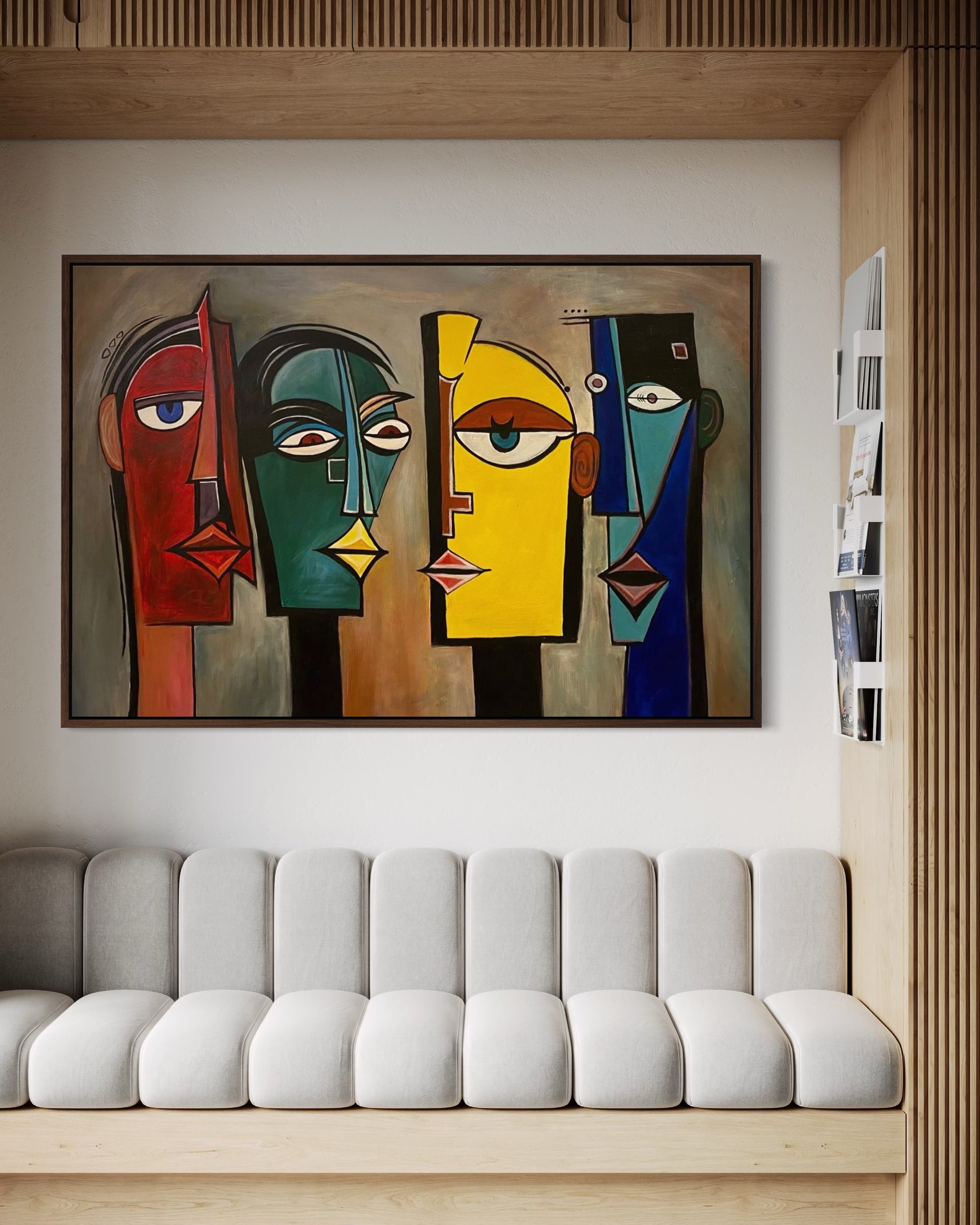 a bold cubist composition where color and geometry merge to tell silent stories. Each face reveals a distinct emotion—together forming a vibrant dialogue about identity, diversity, and human connection. The strong palette of red, green, yellow, and blue creates a rhythmic balance that invites viewers to explore individuality within unity. Perfect for contemporary interiors, this artwork transforms any space into a statement of expression and depth.