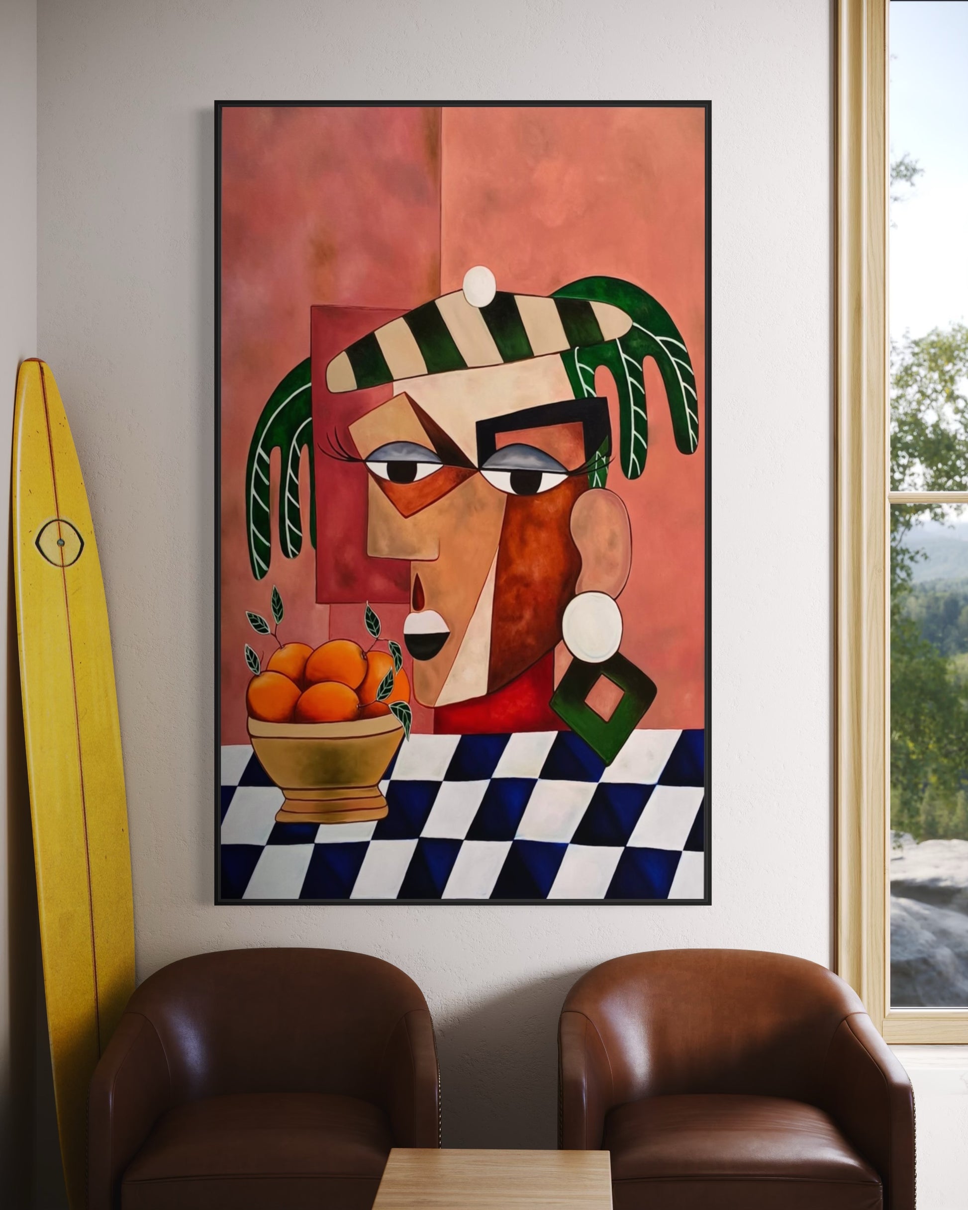 This artwork has a bold, cubist-inspired character, with strong geometric shapes, contrasting colors, and symbolic still-life elements. The playful mix of portrait and fruit bowl suggests a dialogue between identity and daily life.