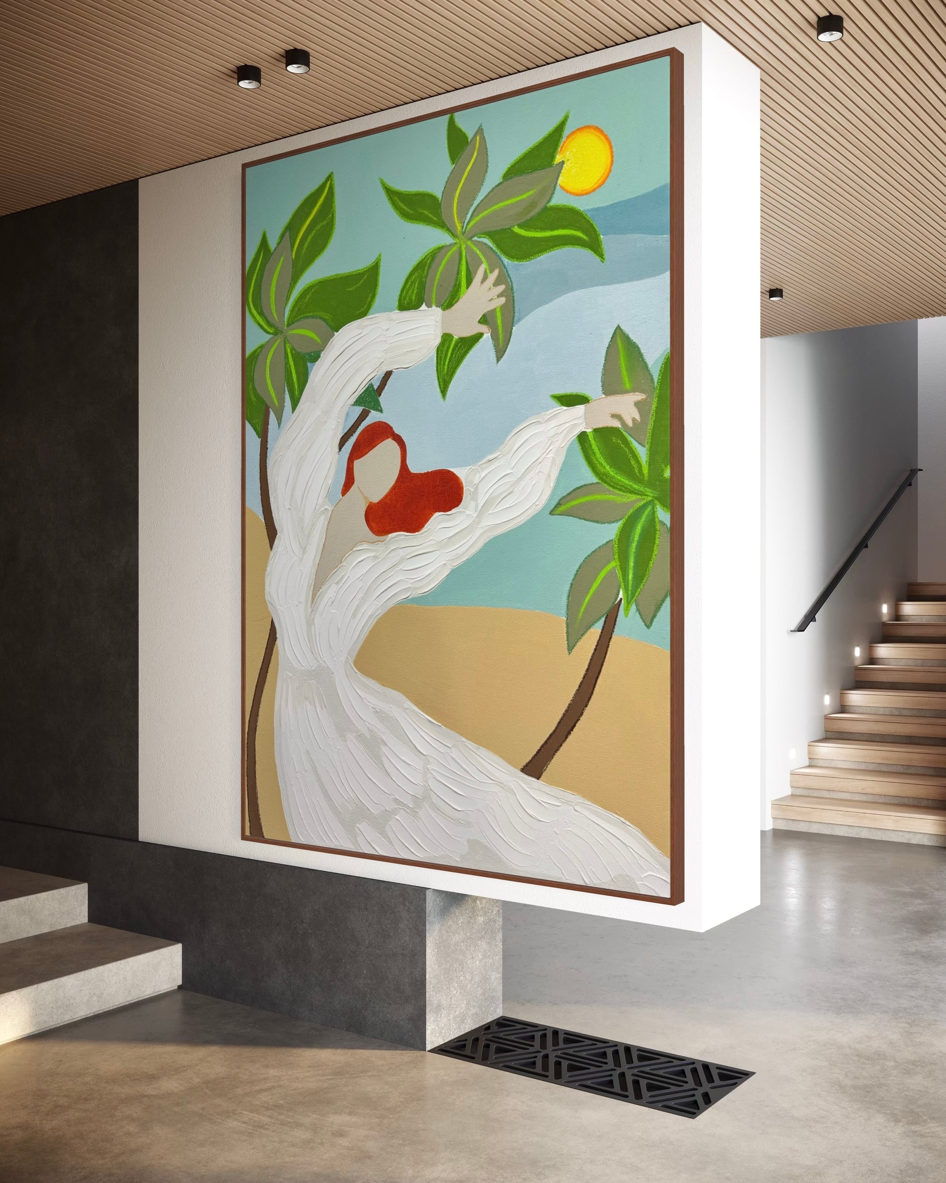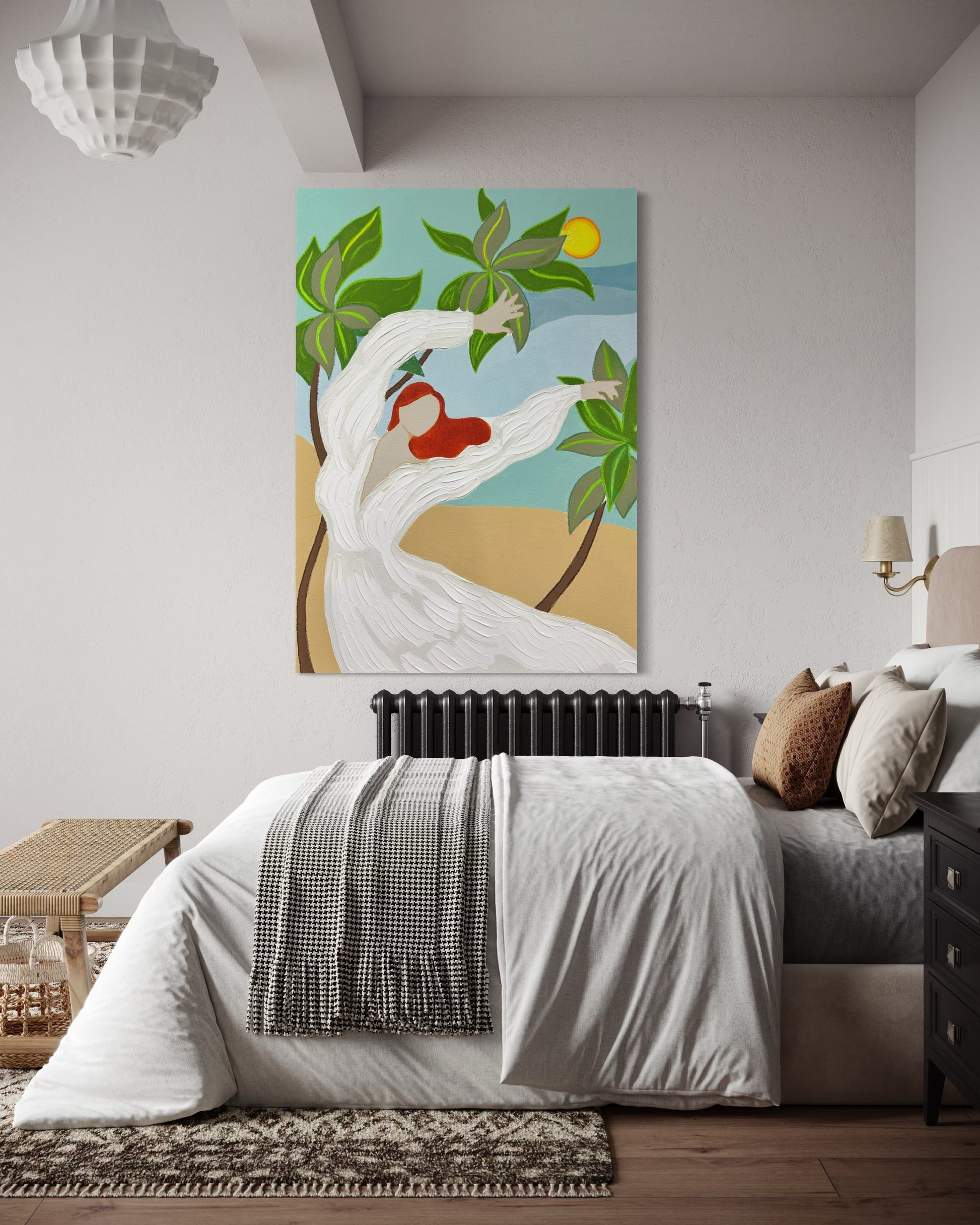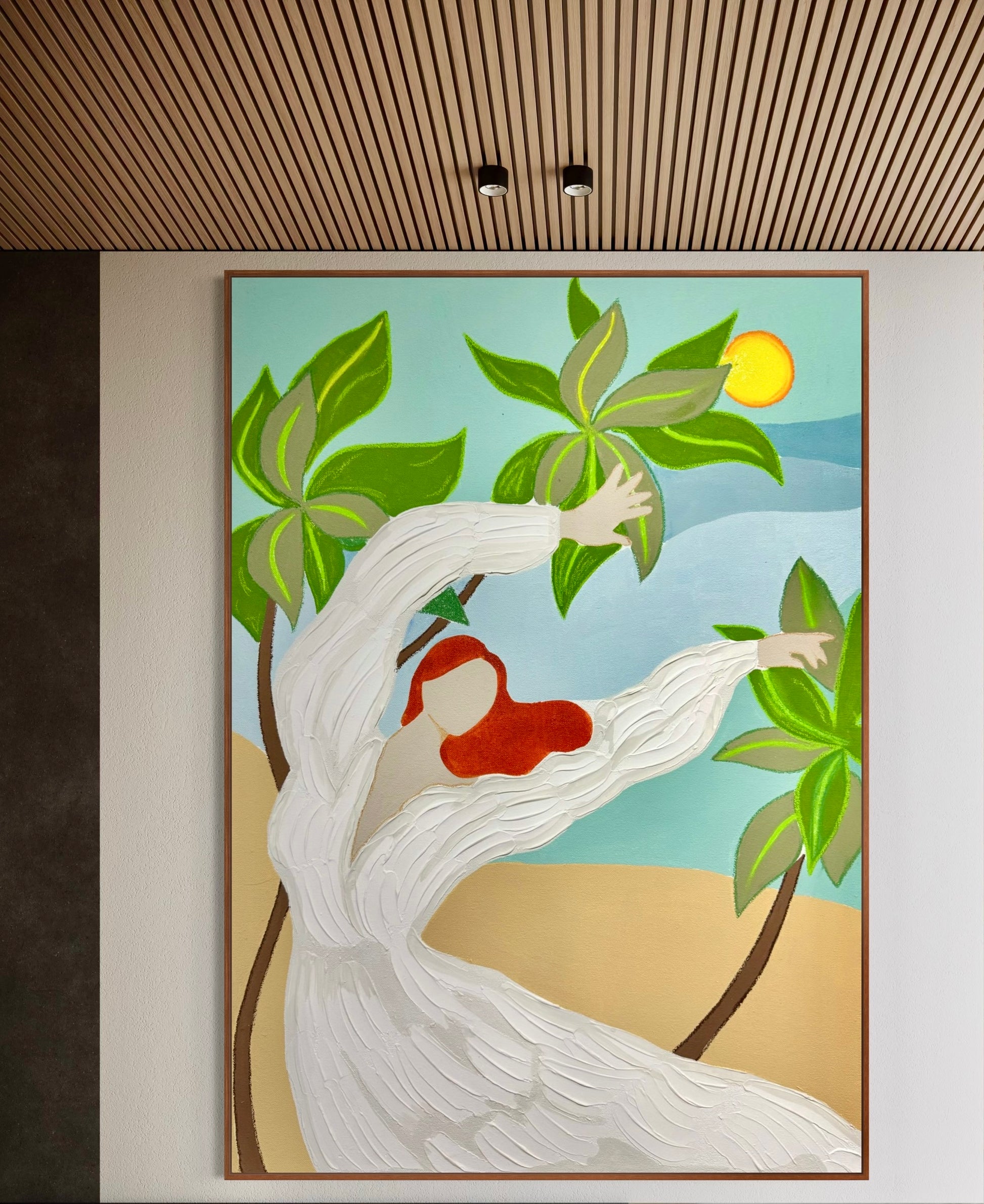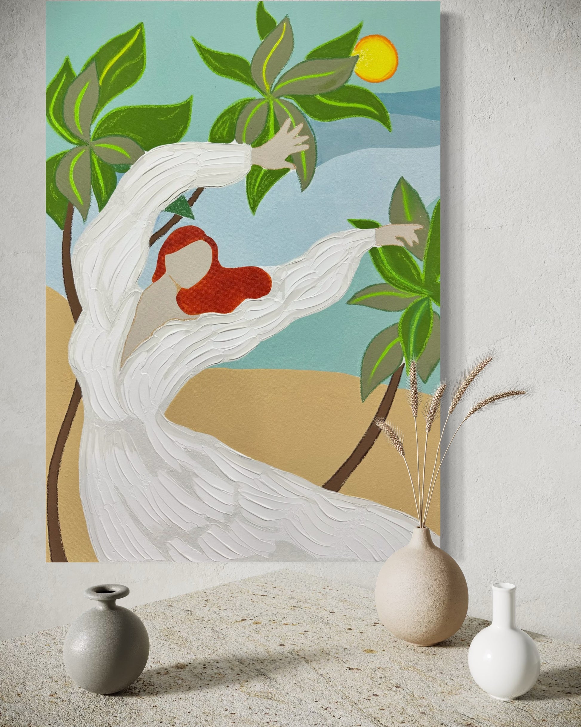 The faceless figure in flowing white, reaching toward the vibrant green leaves under a glowing sun, conveys freedom, joy, and harmony with nature.