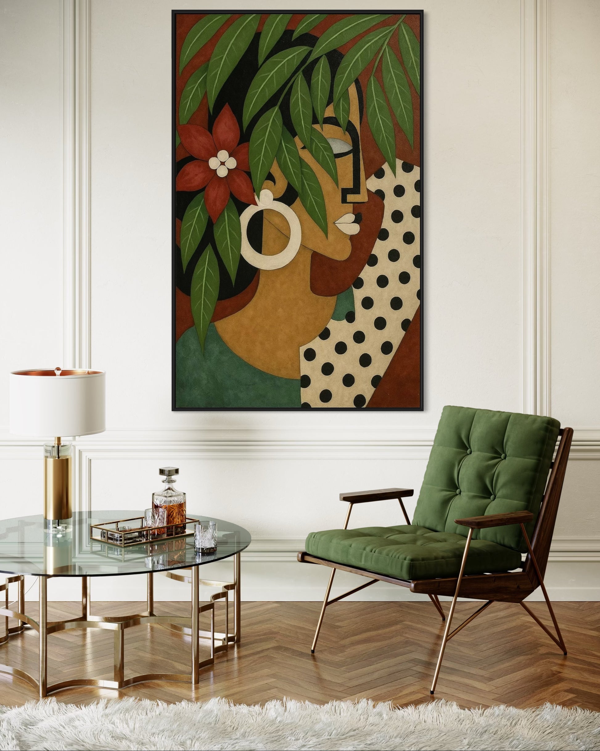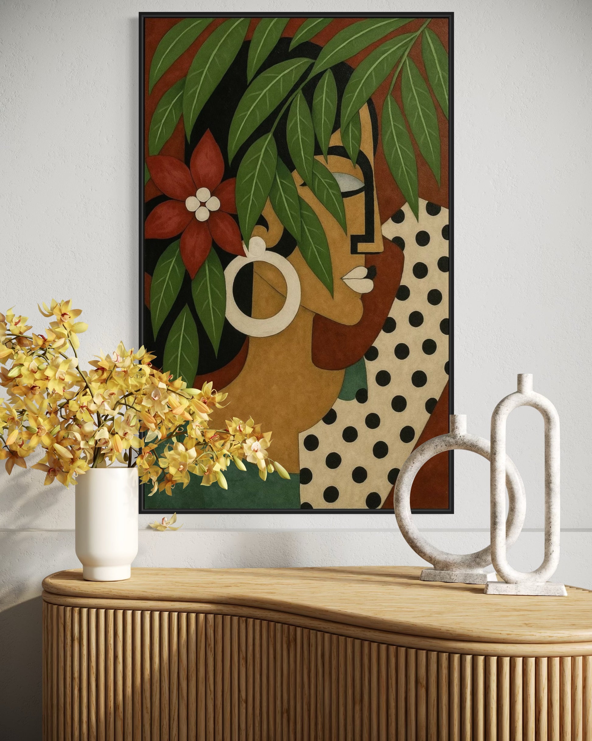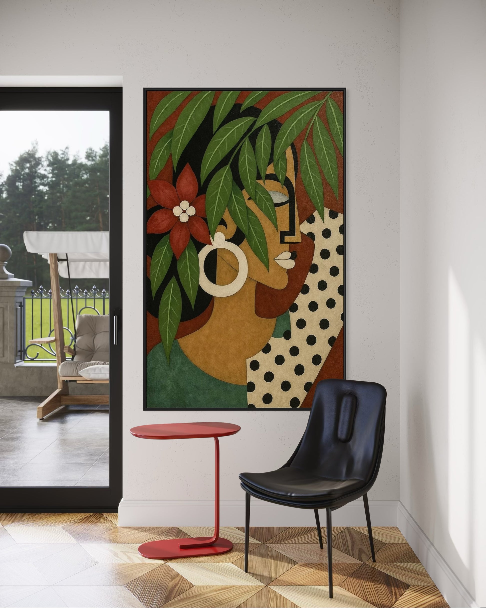 A striking portrait blending Cubist geometry with the softness of nature. Cascading green leaves fall gracefully over the woman’s face and hair, while bold lines, vibrant accents, and a deep red flower capture a balance between strength and serenity. This artwork embodies the harmony of feminine beauty and the untamed spirit of the tropics, making it a captivating centerpiece for modern and elegant spaces.