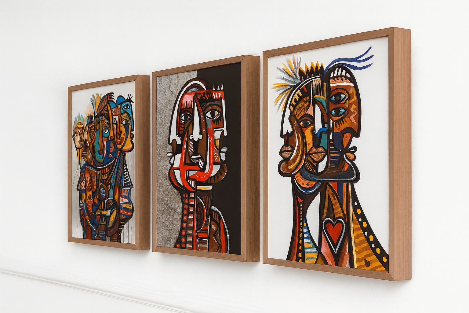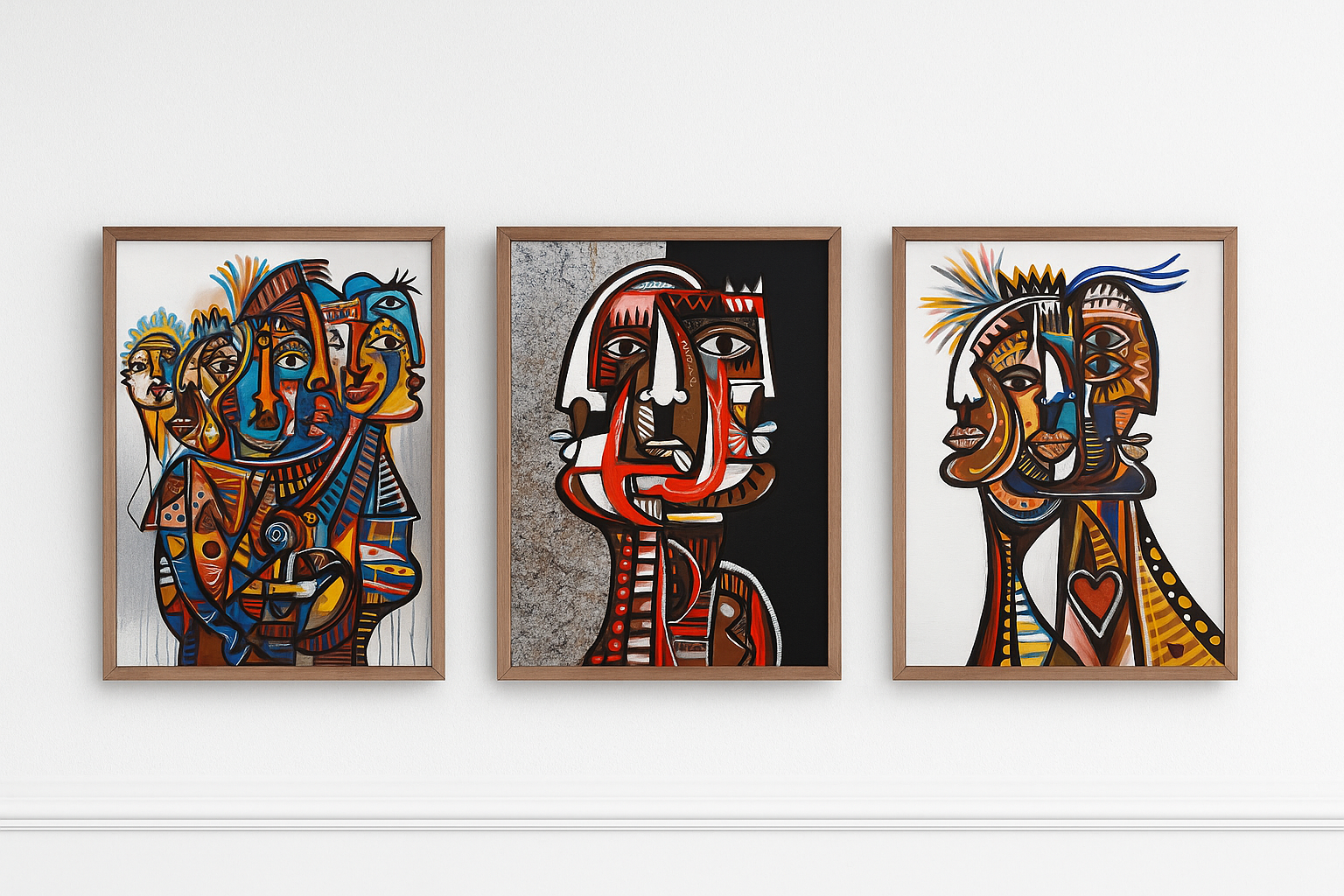 The artwork reflects the layered, overlapping figures, the vibrant colors, and the sense of multiple perspectives and emotions merging into one expressive piece.