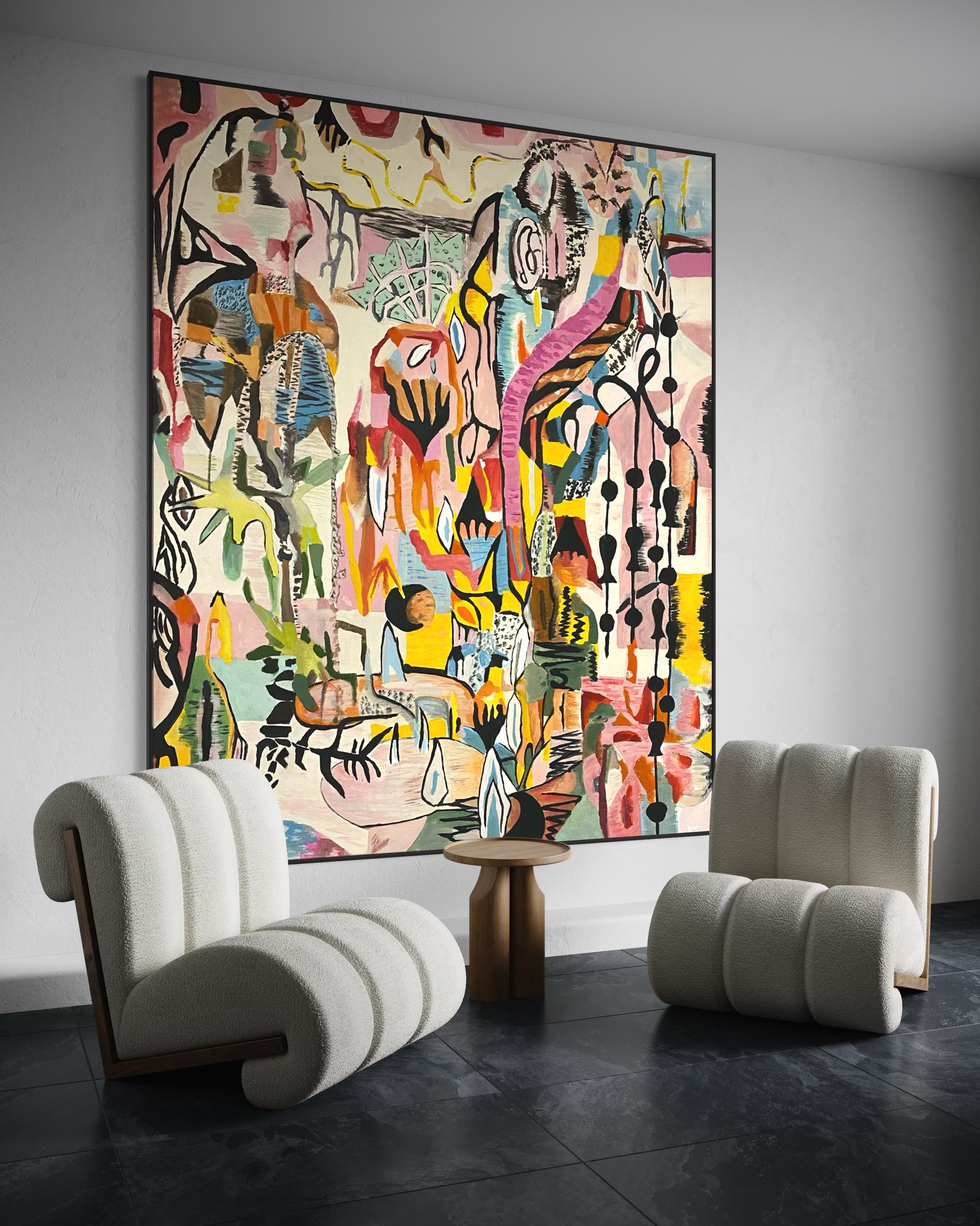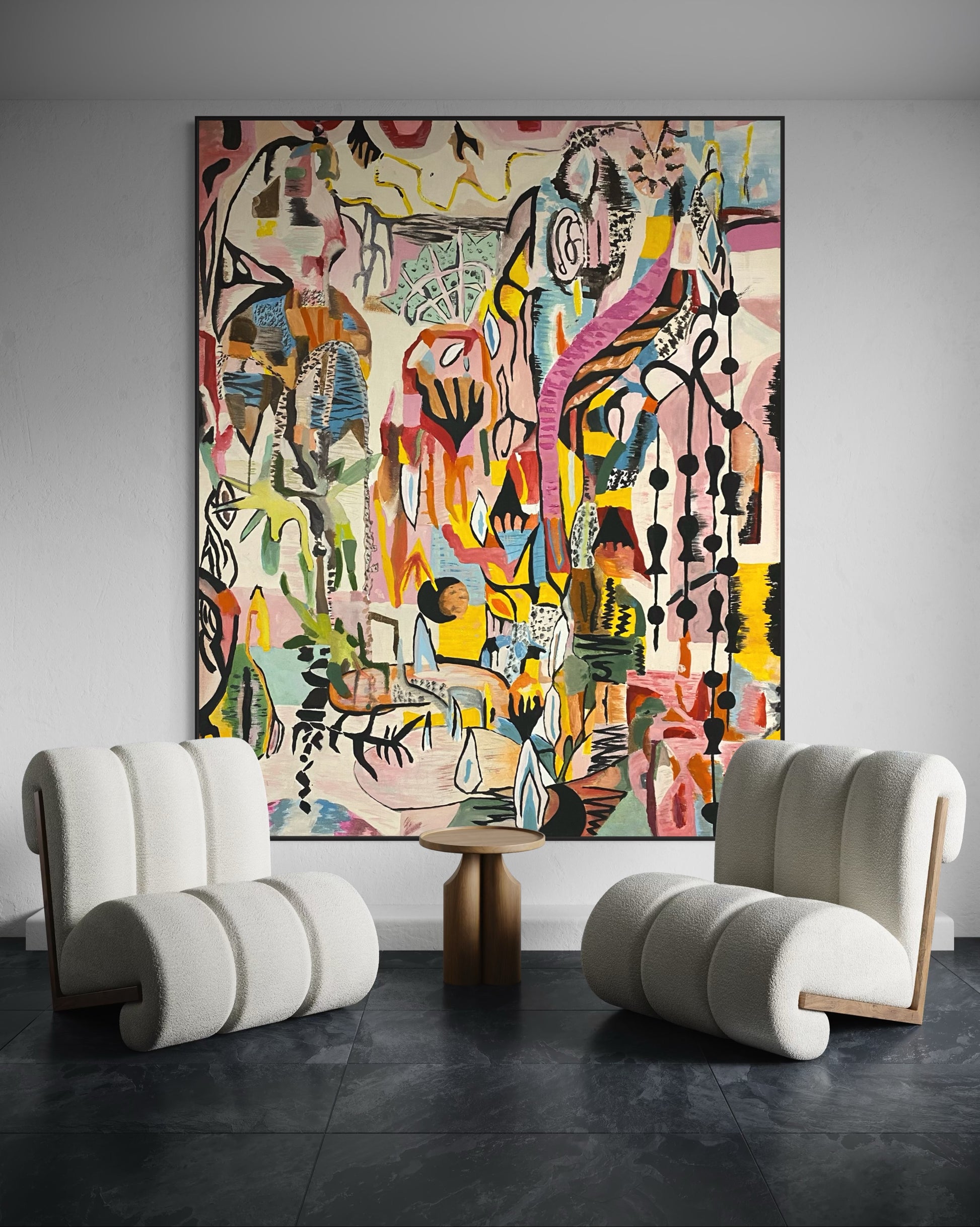 -This piece has a very playful, chaotic, and storytelling energy, full of figures, bold strokes, and layered symbolism.