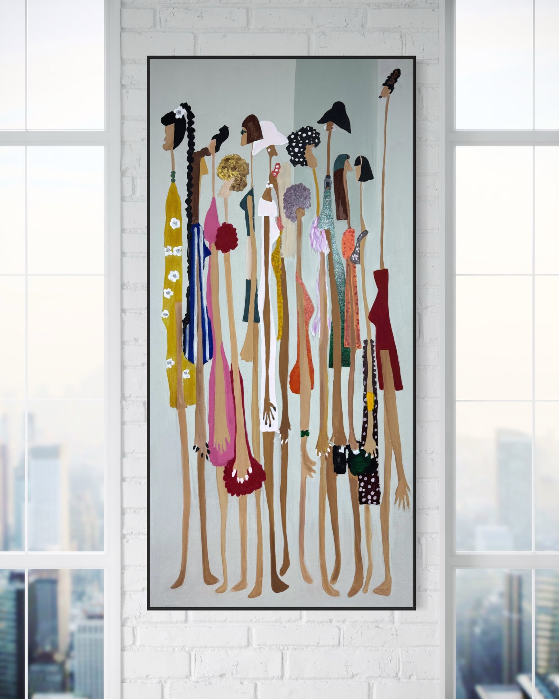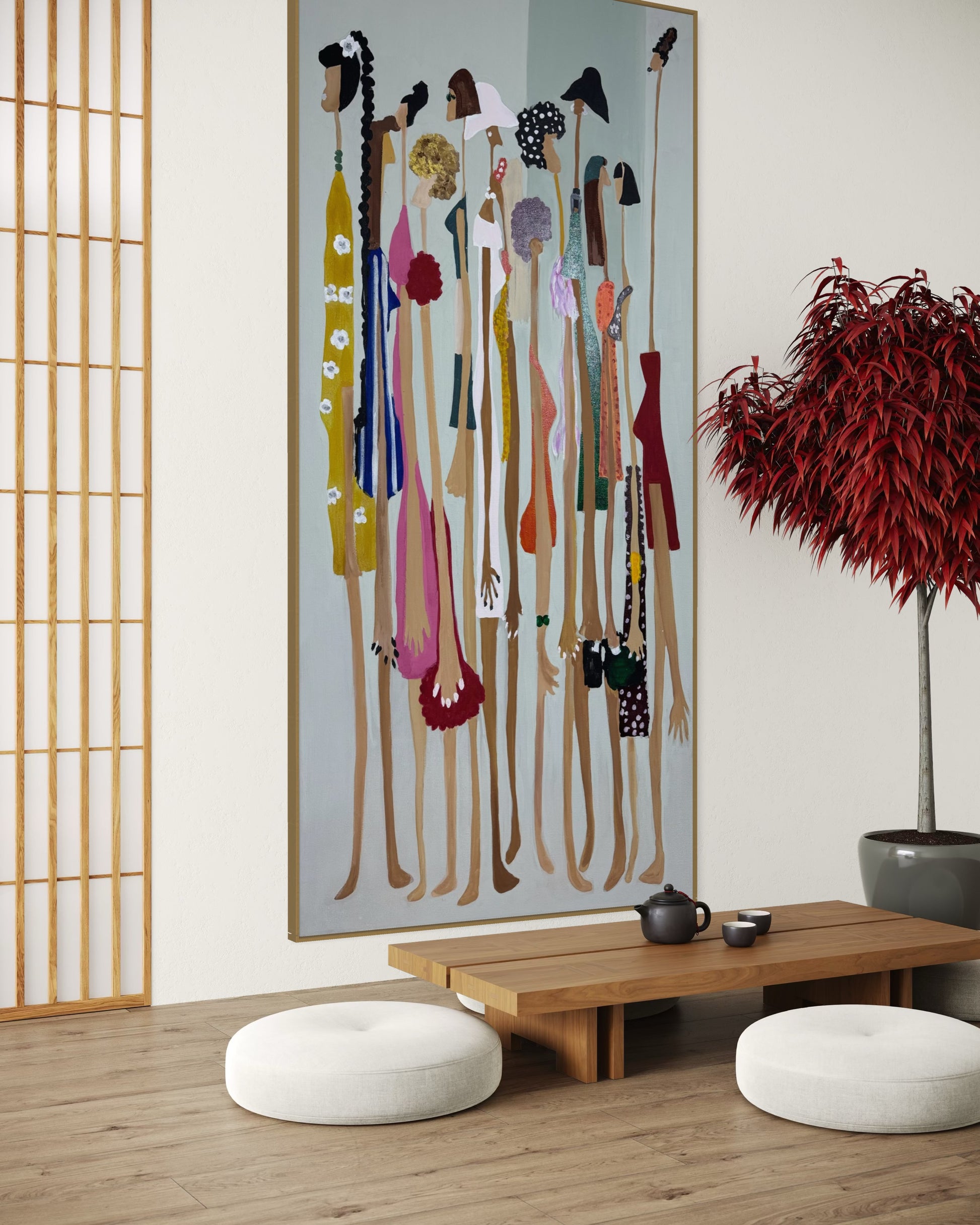 The elongated, elegant figures resemble blooming flowers—each unique in color, style, and detail—standing together like a vibrant garden. Their upward flow and delicate forms radiate femininity, diversity, and harmony, creating a graceful and poetic composition.