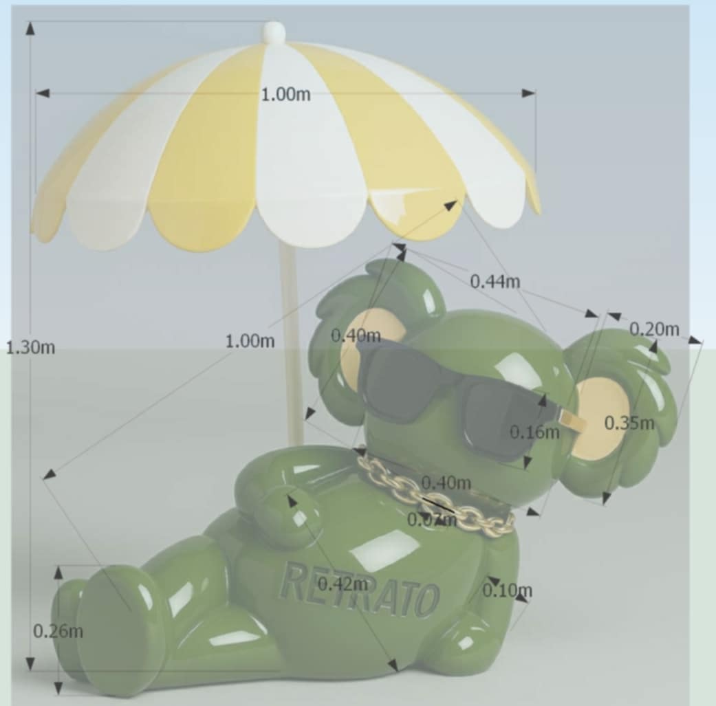 “The King of Cool” is a playful collectible sculpture featuring a glossy green koala lounging under a striped umbrella. Complete with sleek sunglasses, a golden chain, and engraved ‘RETRATO’ branding, this piece embodies effortless style and summer vibes. A modern statement artwork that blends fun, luxury, and character.”