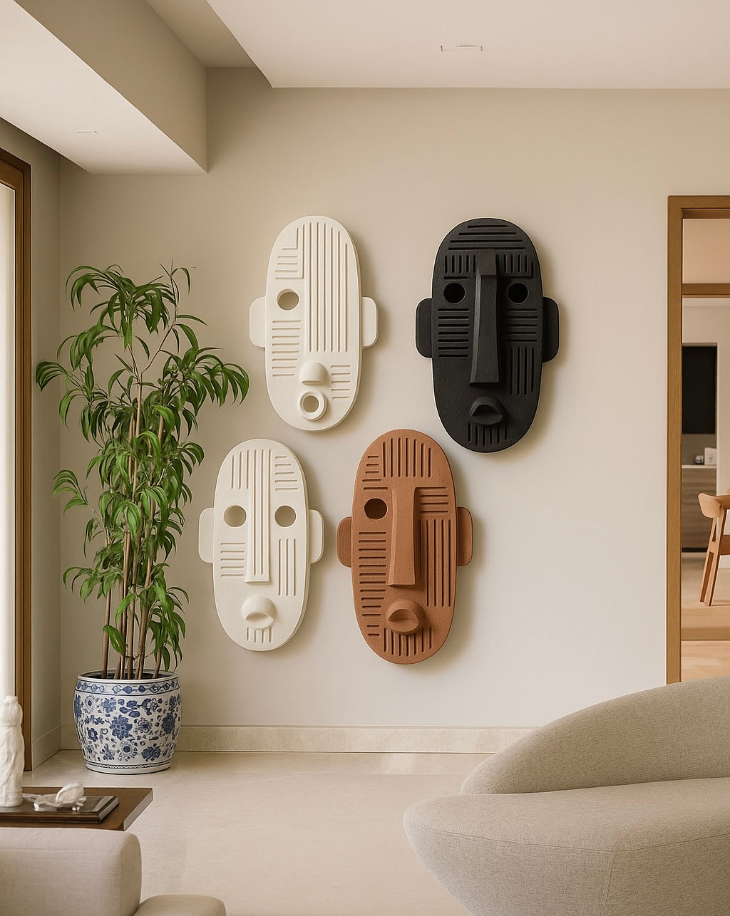 A statement of modern minimalism meets ancestral rhythm. Each mask is hand-crafted with clean geometric lines and bold reliefs, symbolizing the harmony between individuality and unity. The set of four—off-white, terracotta, beige, and black—brings warmth, balance, and cultural depth to any contemporary interior. Perfect for art-driven spaces seeking a sculptural focal point.