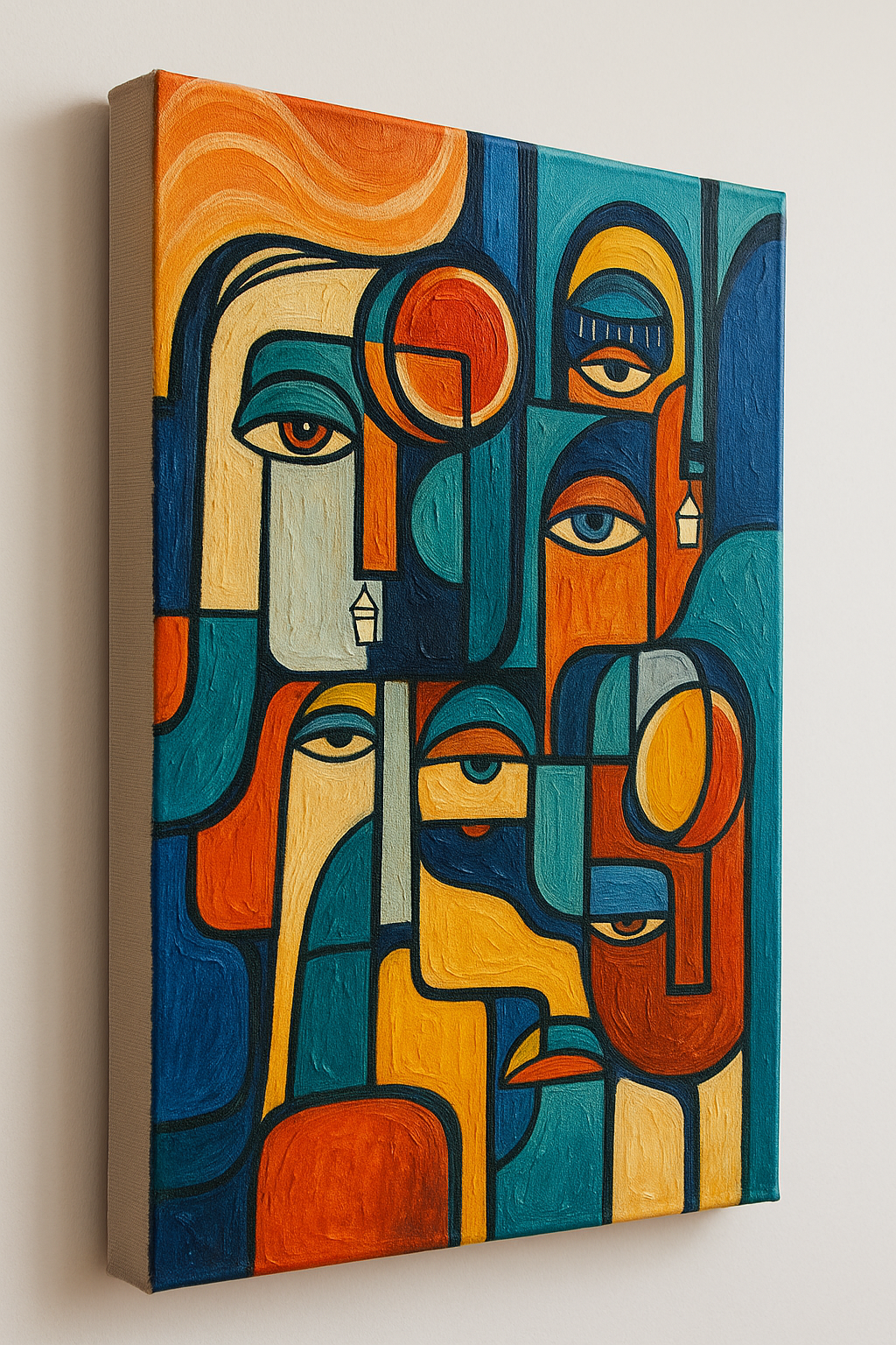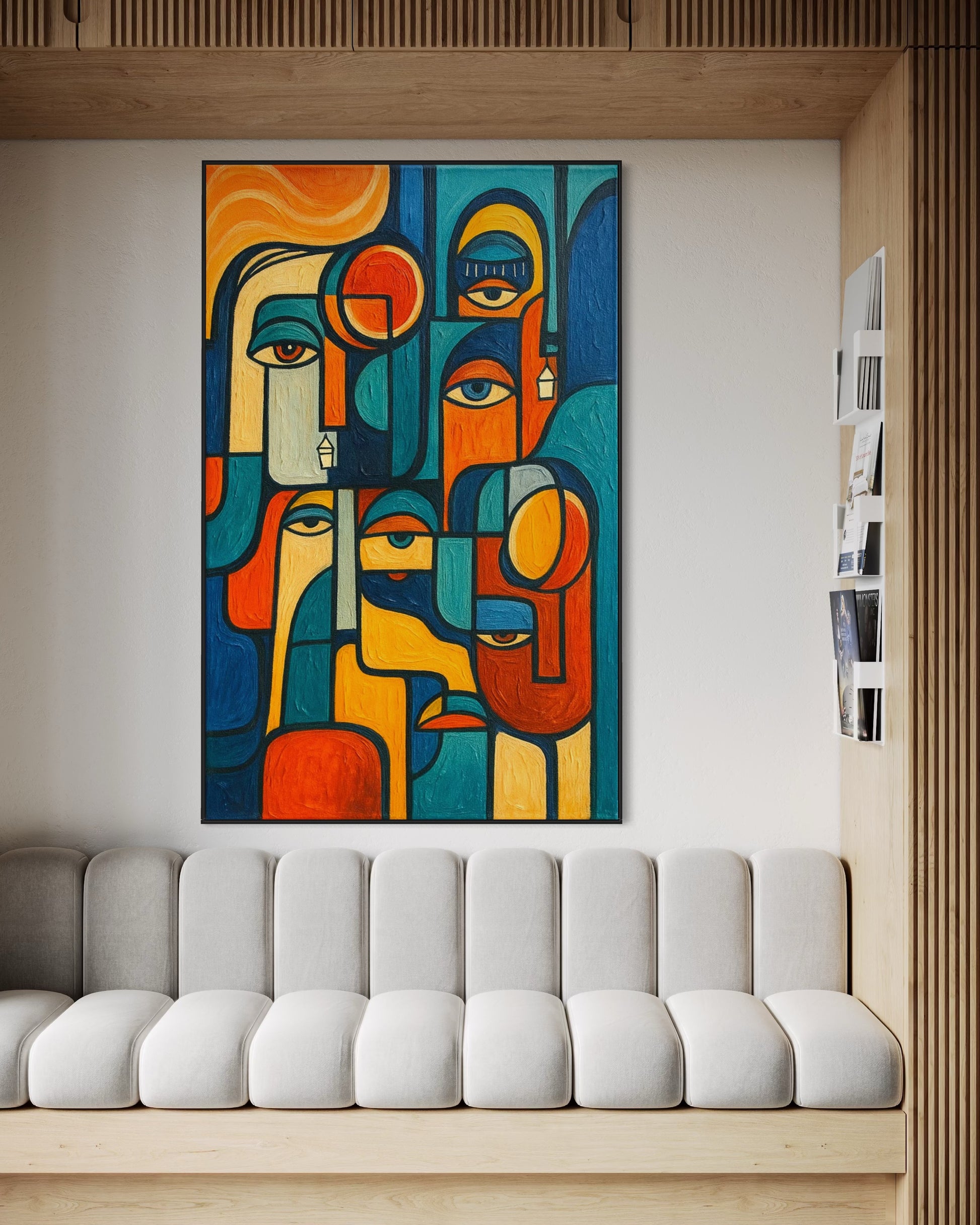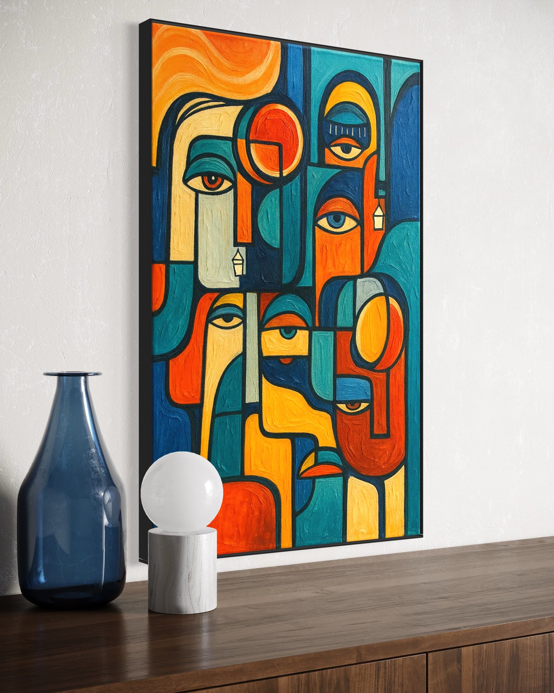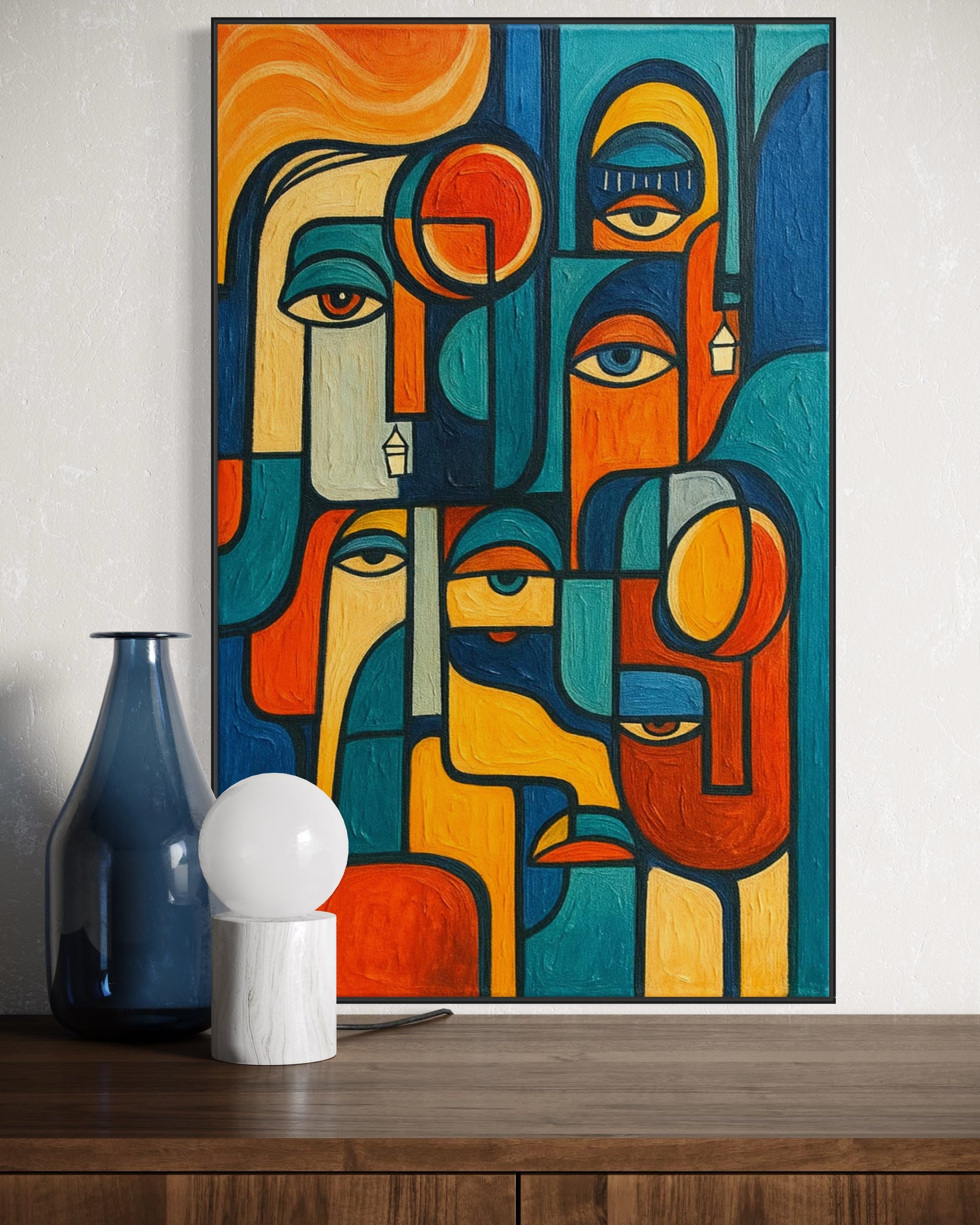 The painting captures the cubist, abstract feel of overlapping faces and the way their features are broken into bold geometric fragments.