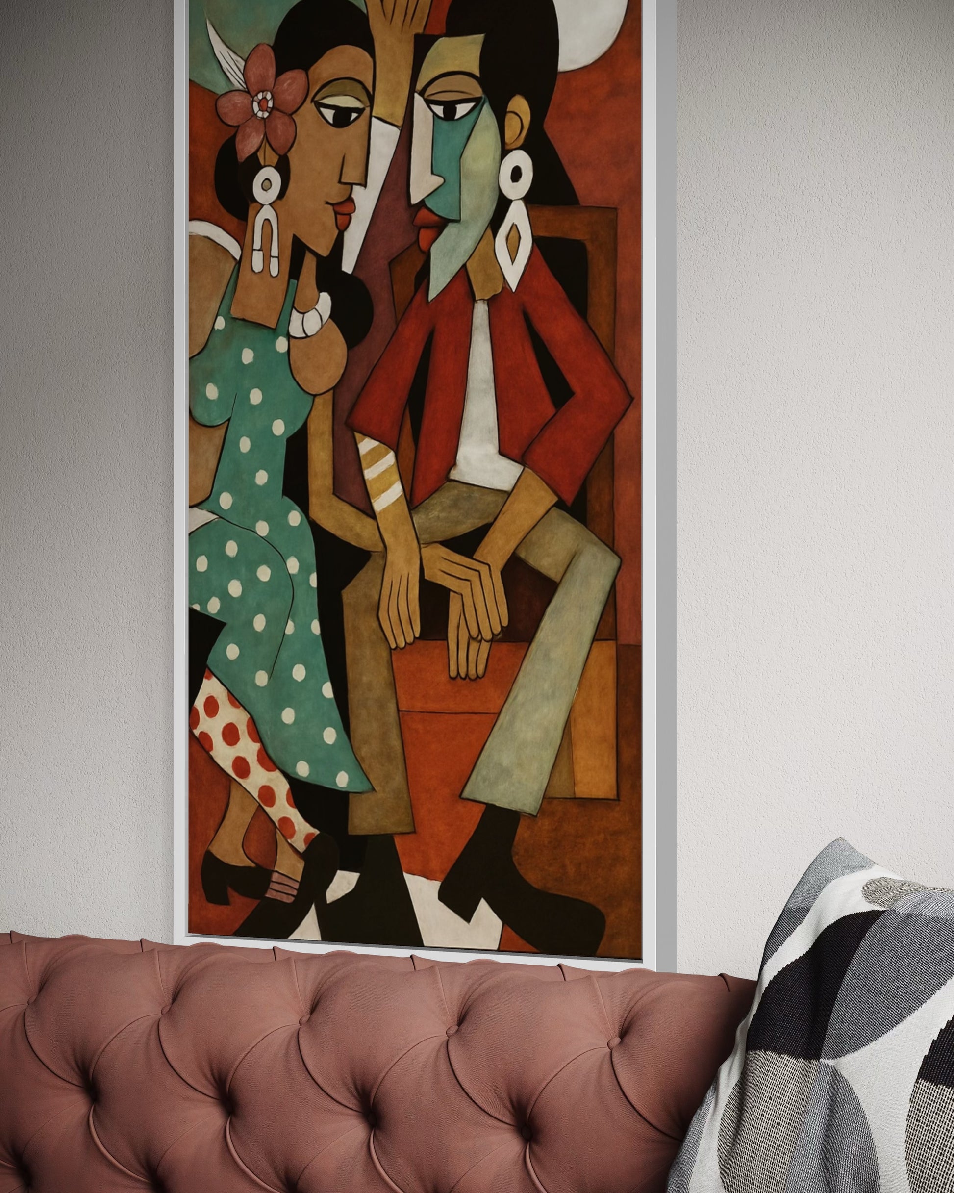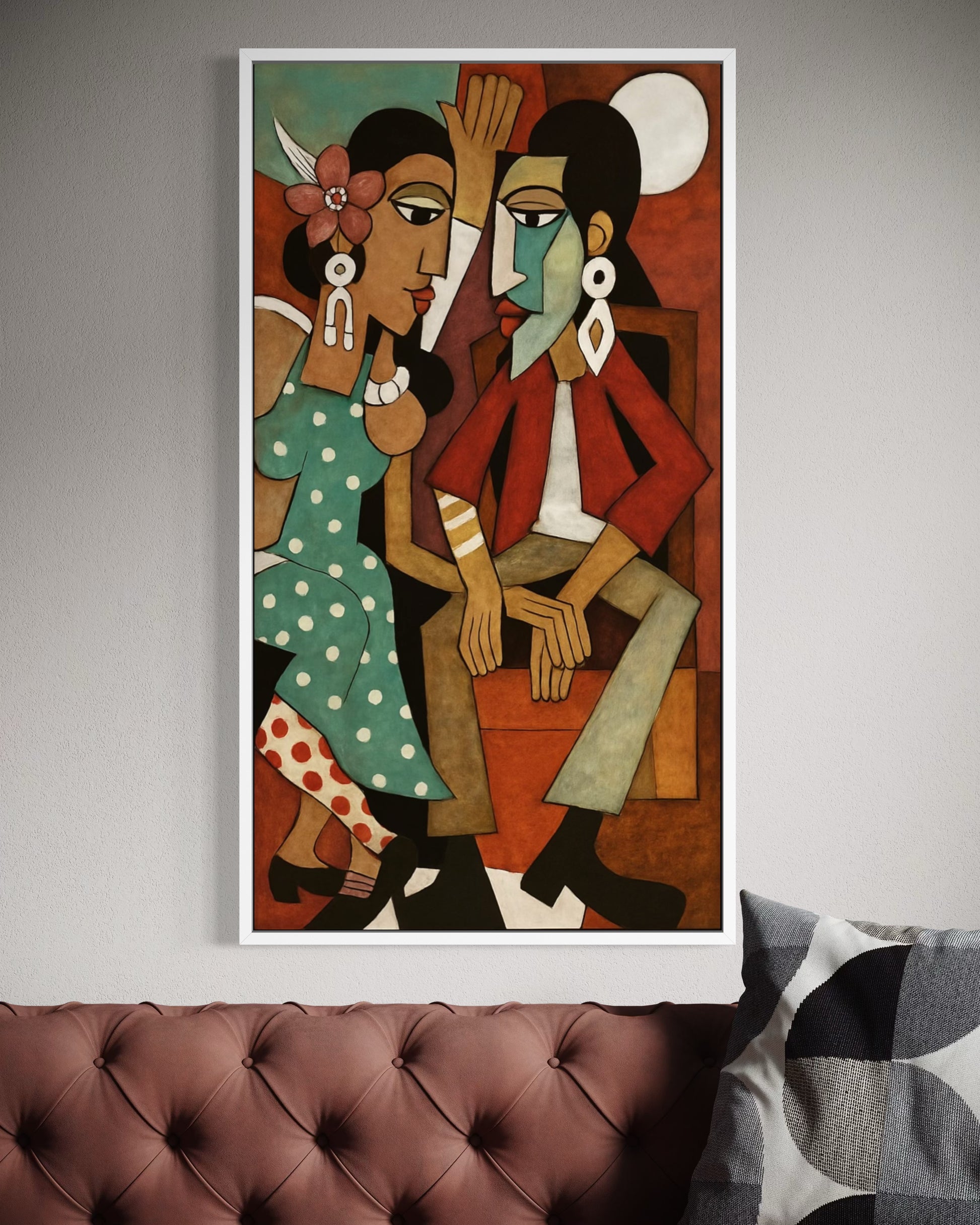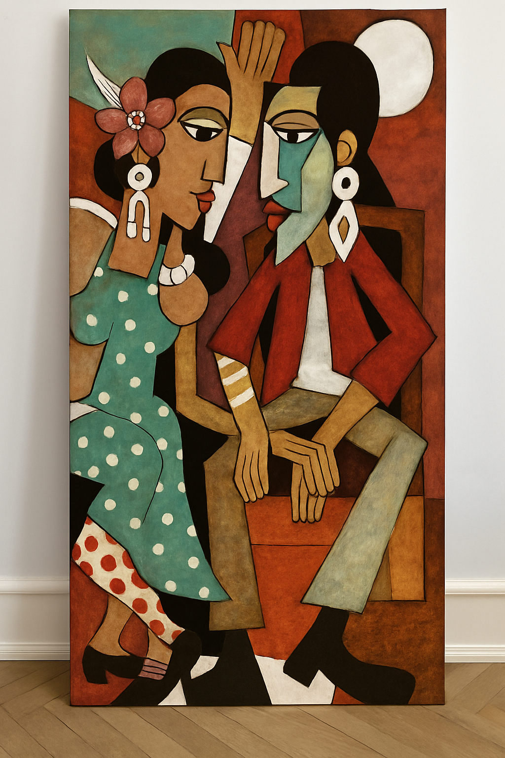 A poetic cubist composition portraying two figures locked in quiet conversation beneath a glowing moon. The scene blends earthy reds and turquoise tones with geometric elegance, symbolizing intimacy, rhythm, and connection. “Whisper of the Moon” captures the essence of passion and stillness, a timeless dialogue between color, form, and emotion.