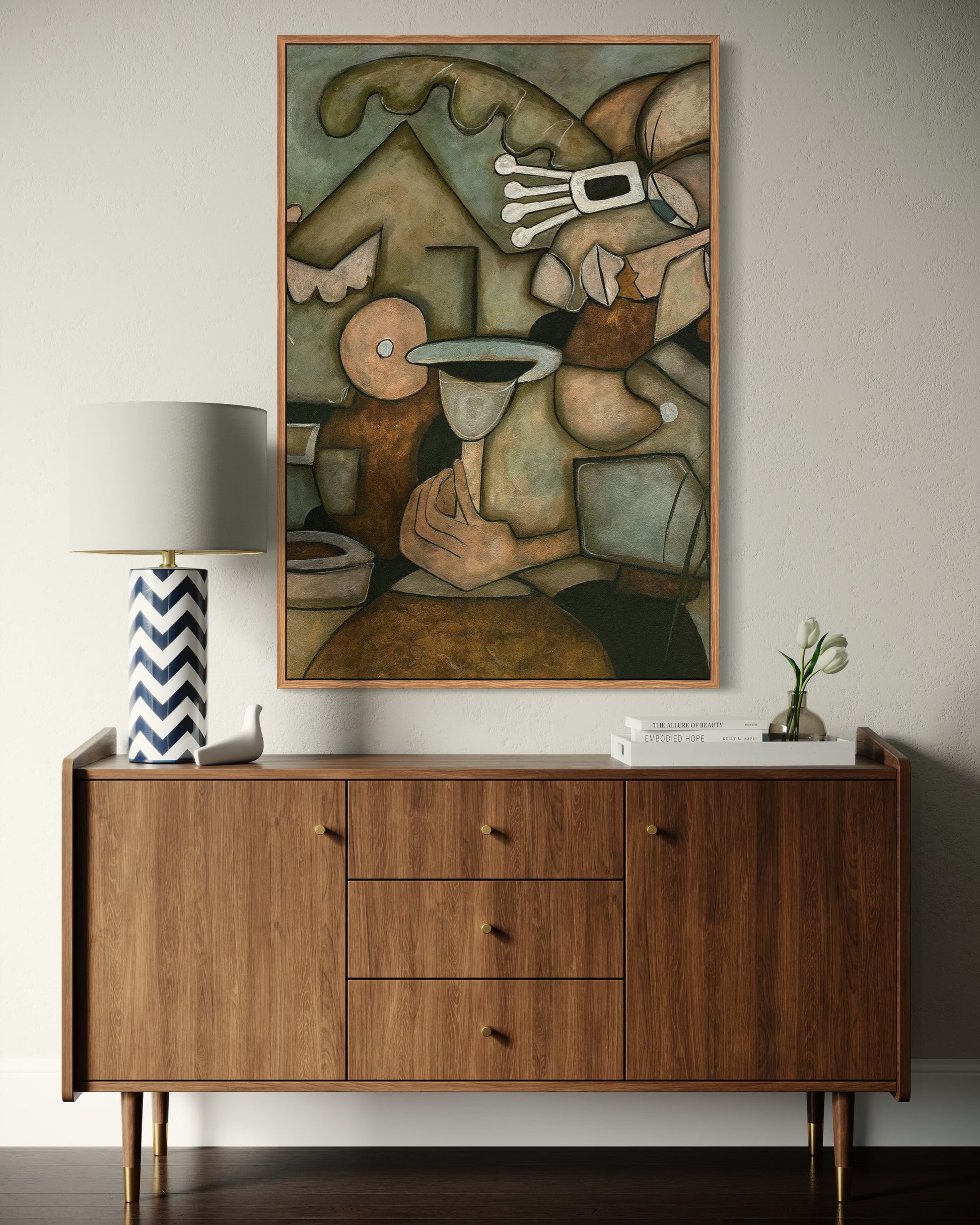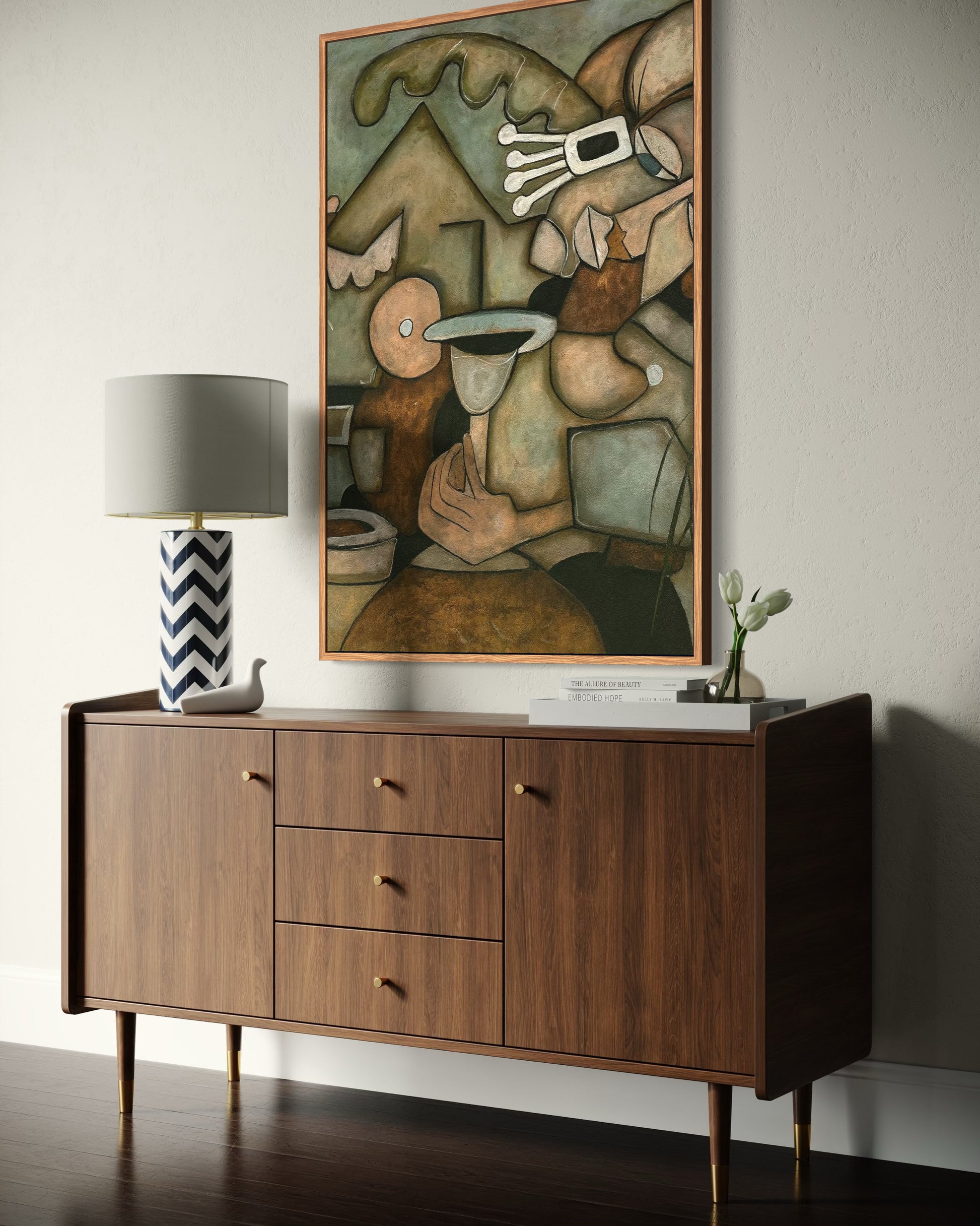 A harmonious blend of cubist abstraction and human warmth, Solace captures an intimate moment suspended in time. Through interlocking geometric forms and earthy muted tones, the figures seem to raise a glass in silent reflection — a celebration of calm, connection, and quiet beauty. This piece invites viewers to pause and feel the stillness behind everyday rituals.