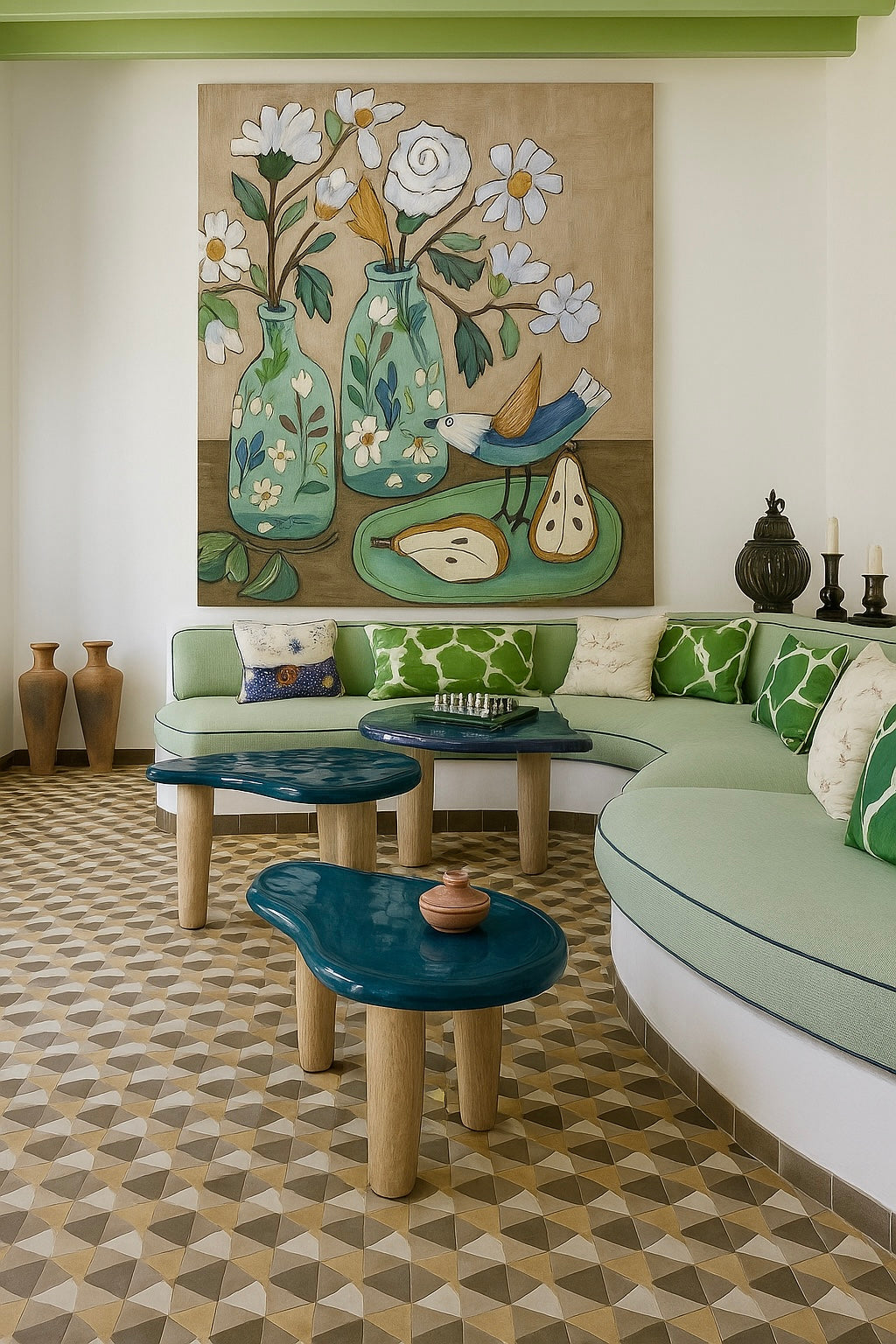 A charming still life composition featuring hand-painted florals, ripe pears, and a playful bird perched gracefully on a ceramic tray. Rendered in soft earthy tones and delicate linework, this artwork blends folk-art nostalgia with modern simplicity — perfect for adding warmth and character to any space.