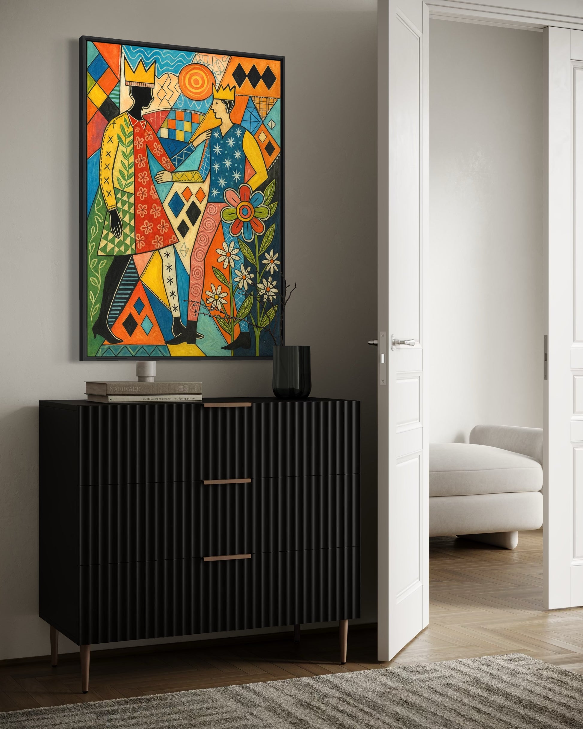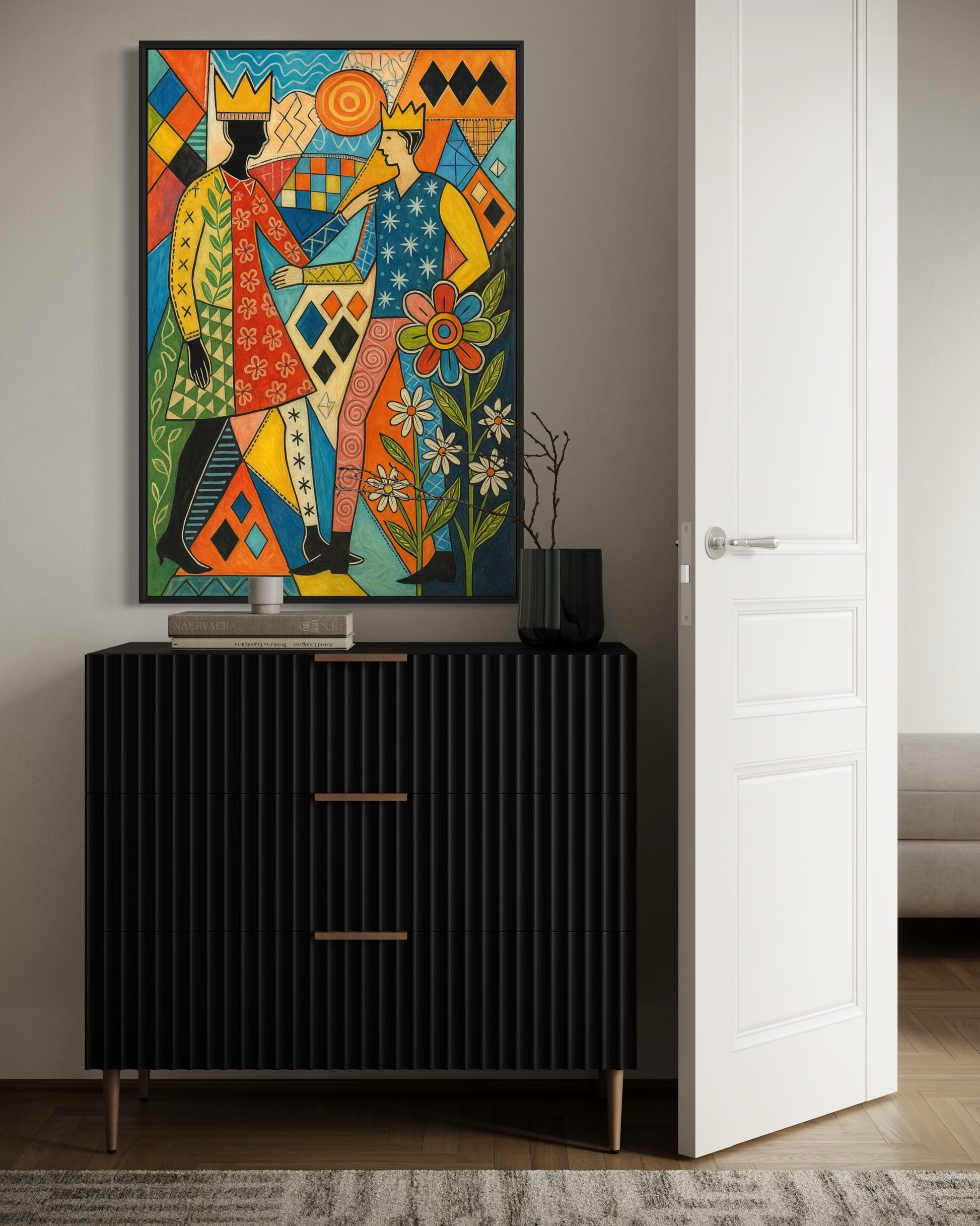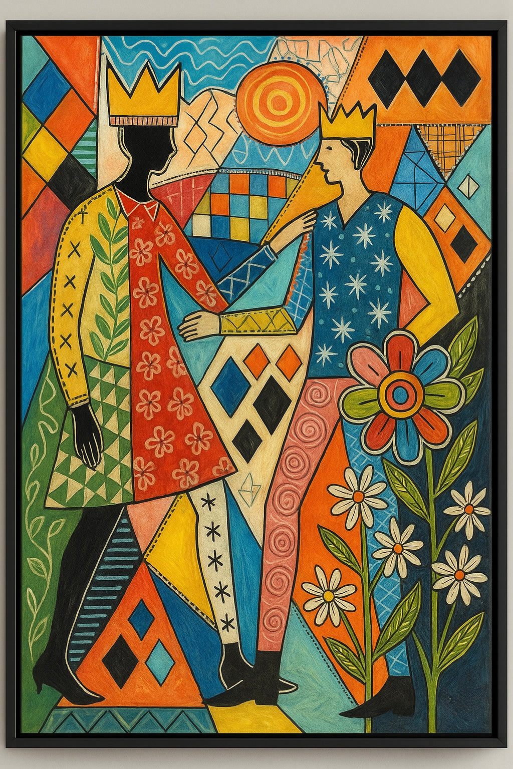 a striking moment between two crowned king and queen standing face-to-face in a vibrant, dreamlike world. Geometric patterns, bold colors, and blooming florals weave together to create a narrative of connection, balance, and silent dialogue.