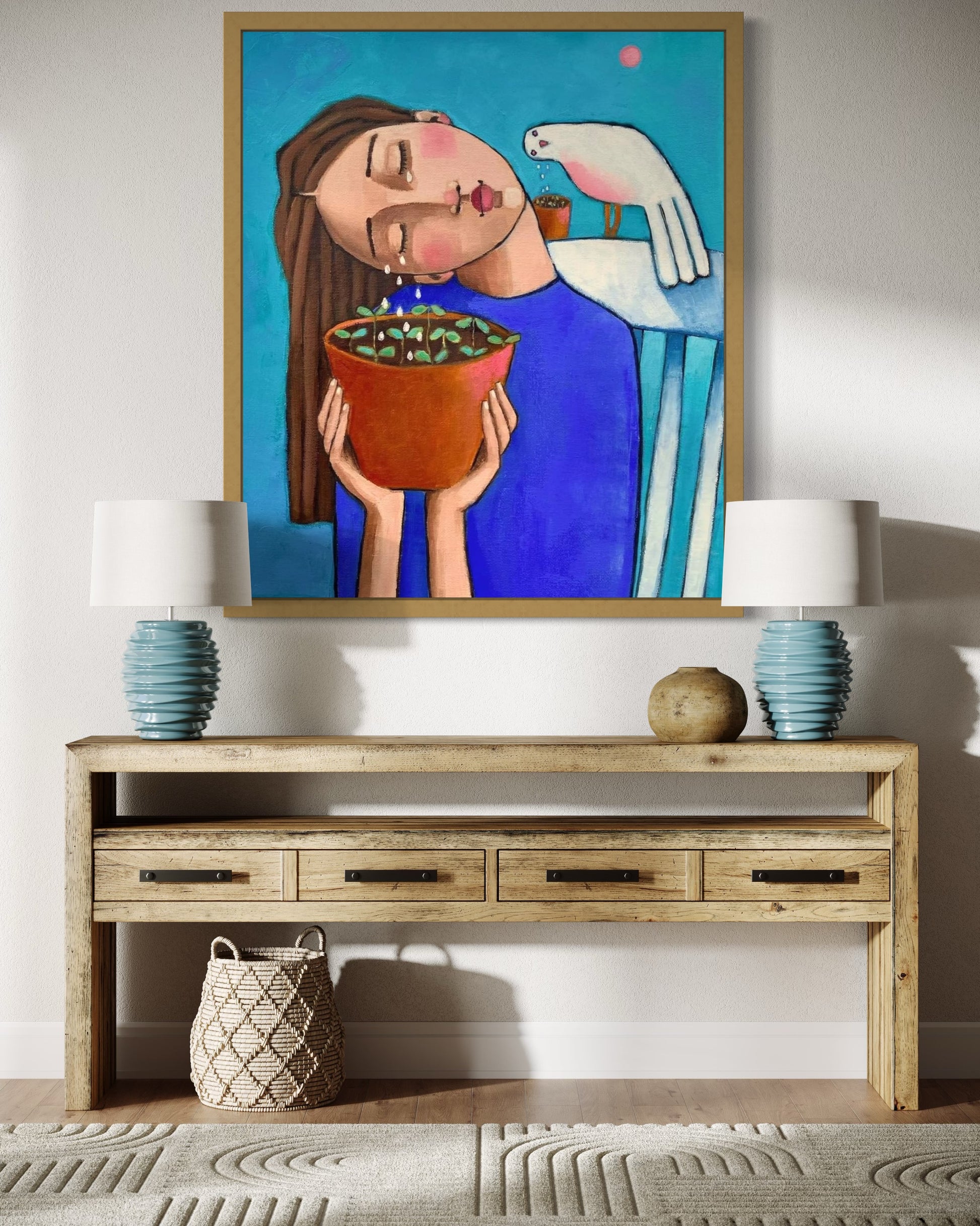the artwork reflects both the emotional tenderness of the girl’s tears and the hopeful symbolism of the sprouts she nurtures, with the bird gently participating in the act of renewal.
