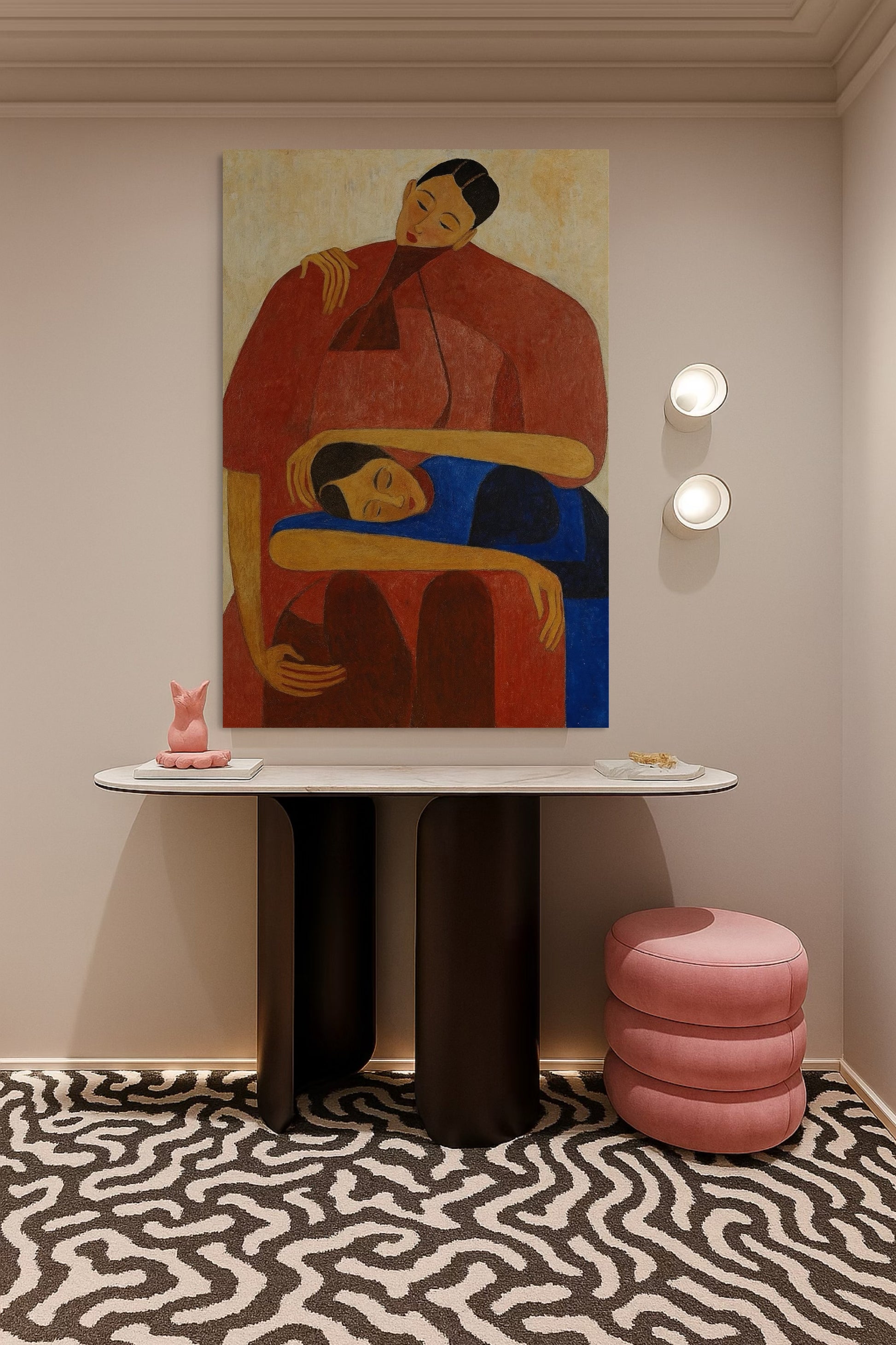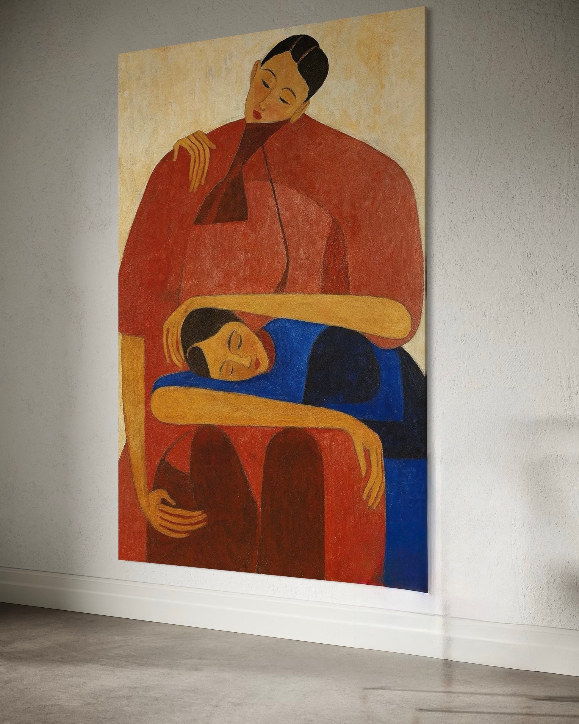 The artwork captures the warmth, intimacy, and peacefulness of one figure leaning on another in a quiet moment of comfort.