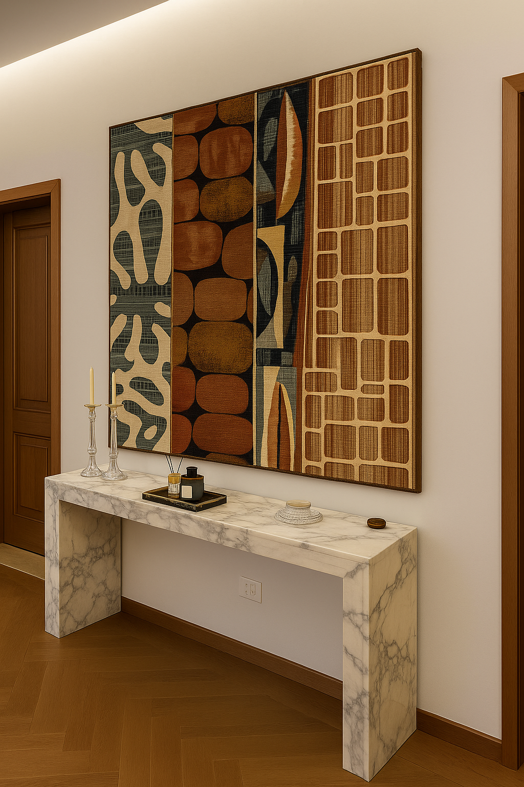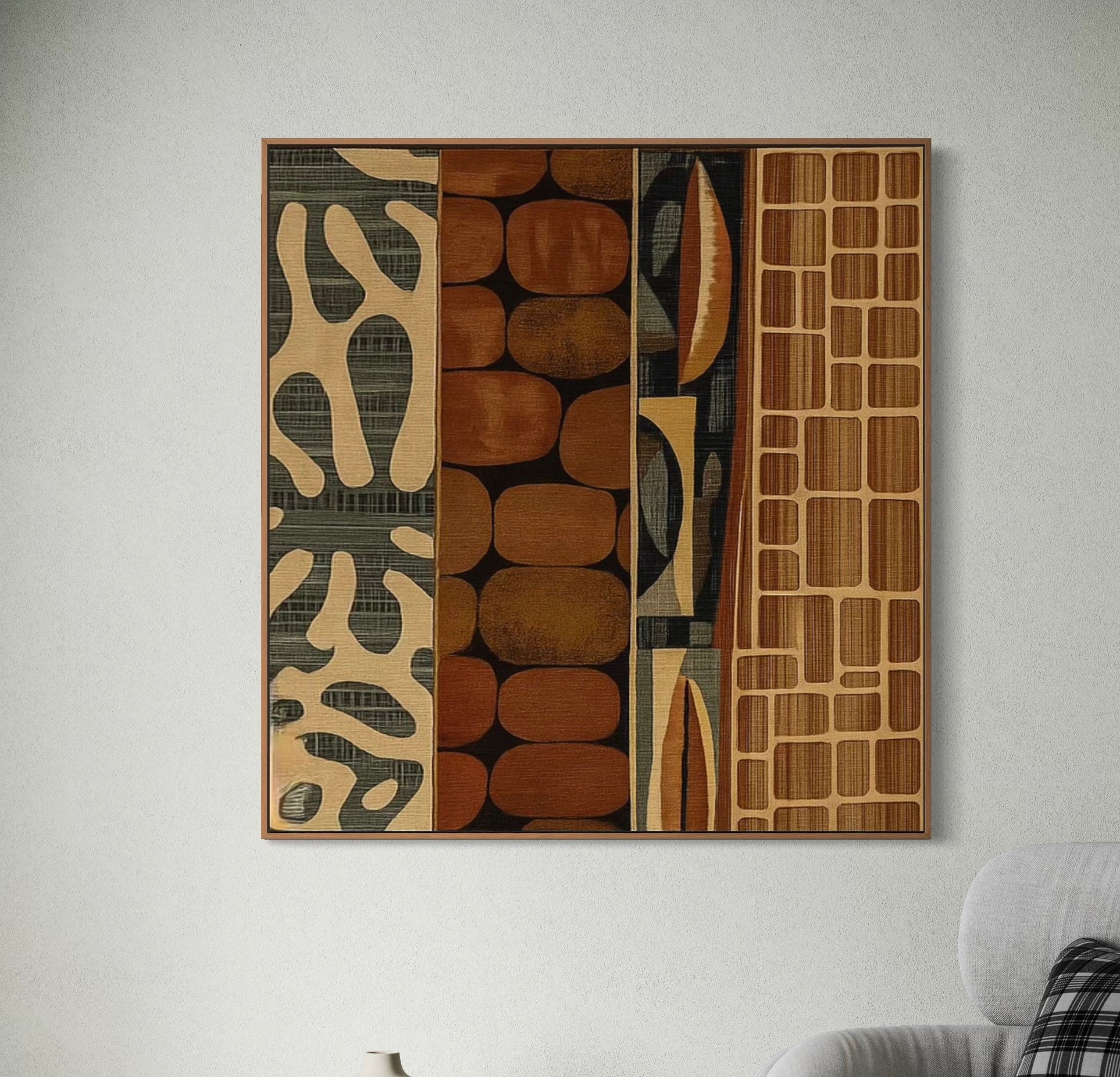 The painting captures the harmony between structure and spontaneity. With its blend of geometric forms and organic shapes in warm terracotta and earthy tones, this piece evokes a sense of balance and rhythm reminiscent of mid-century modern design. Each panel tells a quiet story of texture and movement, making it an elegant statement for contemporary interiors. Perfect above a marble console or in minimalist spaces seeking warmth and artistic depth.