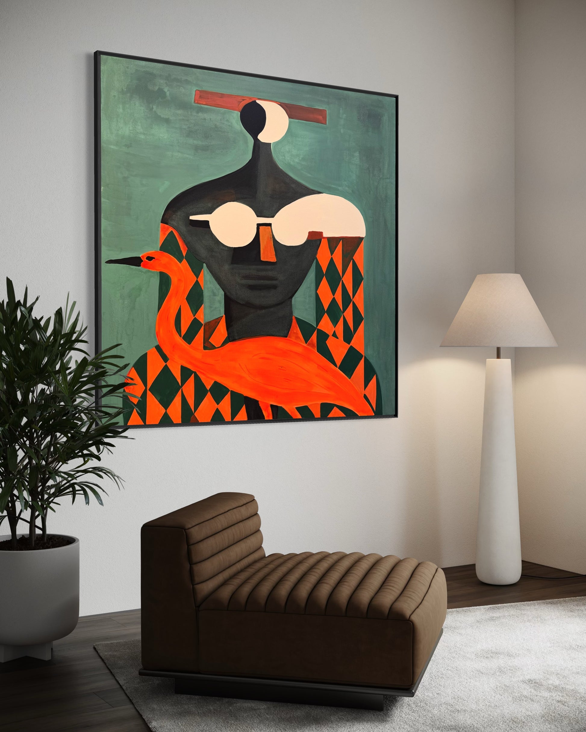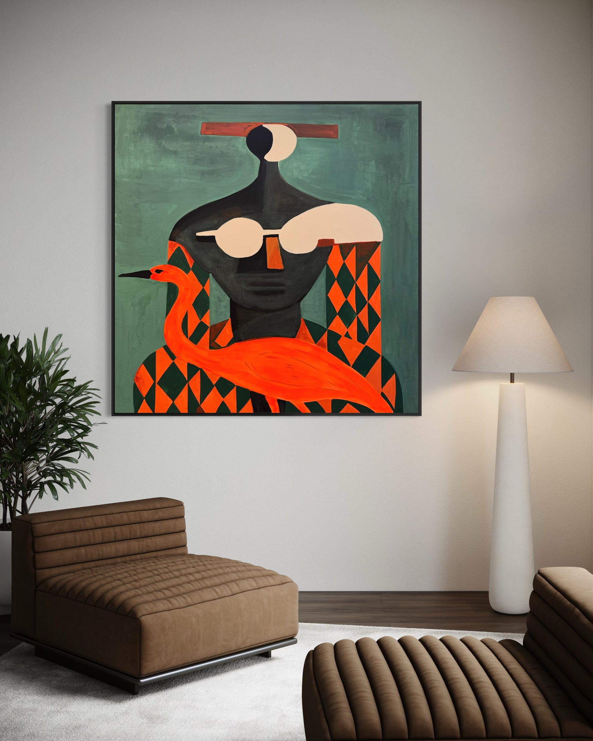 A striking abstract composition that embodies strength, balance, and quiet power. The dark figure stands calm and composed, contrasted by the vivid orange bird that symbolizes vitality and spirit. With its bold geometric patterns and harmonious color palette, this artwork celebrates the unity between inner peace and vibrant energy — a statement piece for modern, soulful interiors.