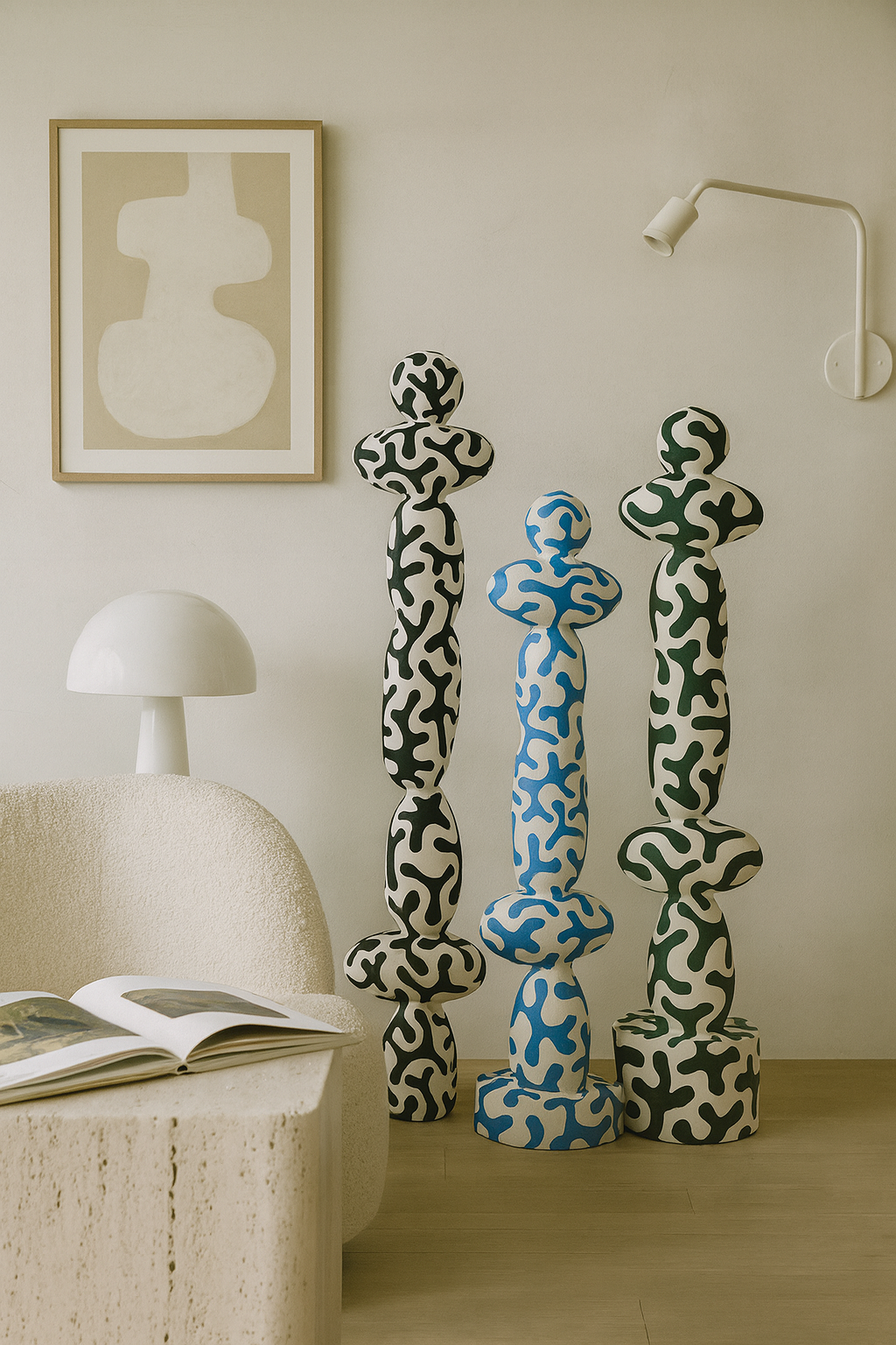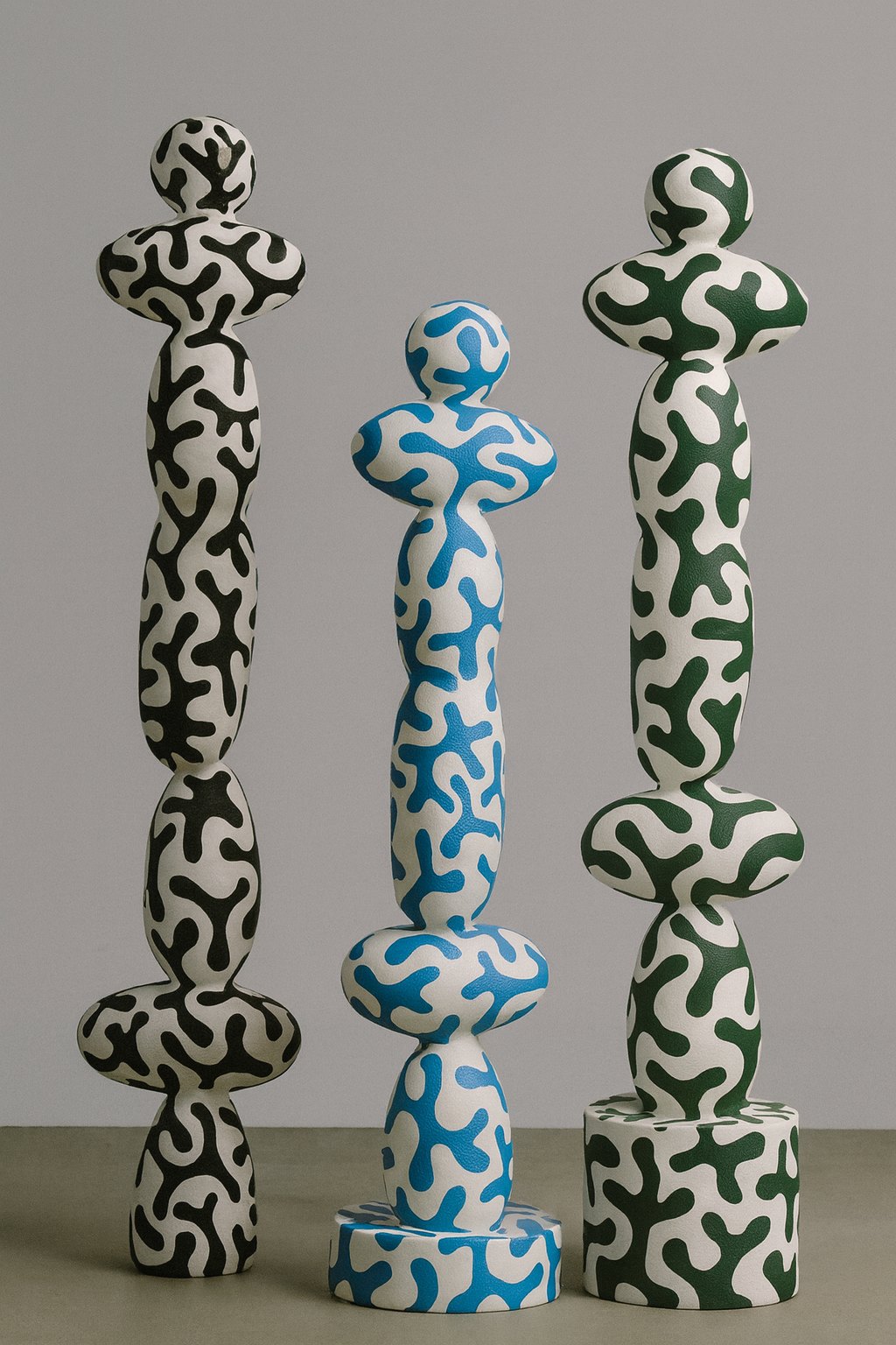 A sculptural trio celebrating rhythm, contrast, and organic motion. Each totem—Eclipse, Tide, and Verdant—embodies a unique dialogue between nature and abstraction. Hand-crafted with flowing patterns and soft contours, these pieces bring harmony and movement to any contemporary space. Designed to stand alone or together, they evoke a quiet balance between energy and stillness.