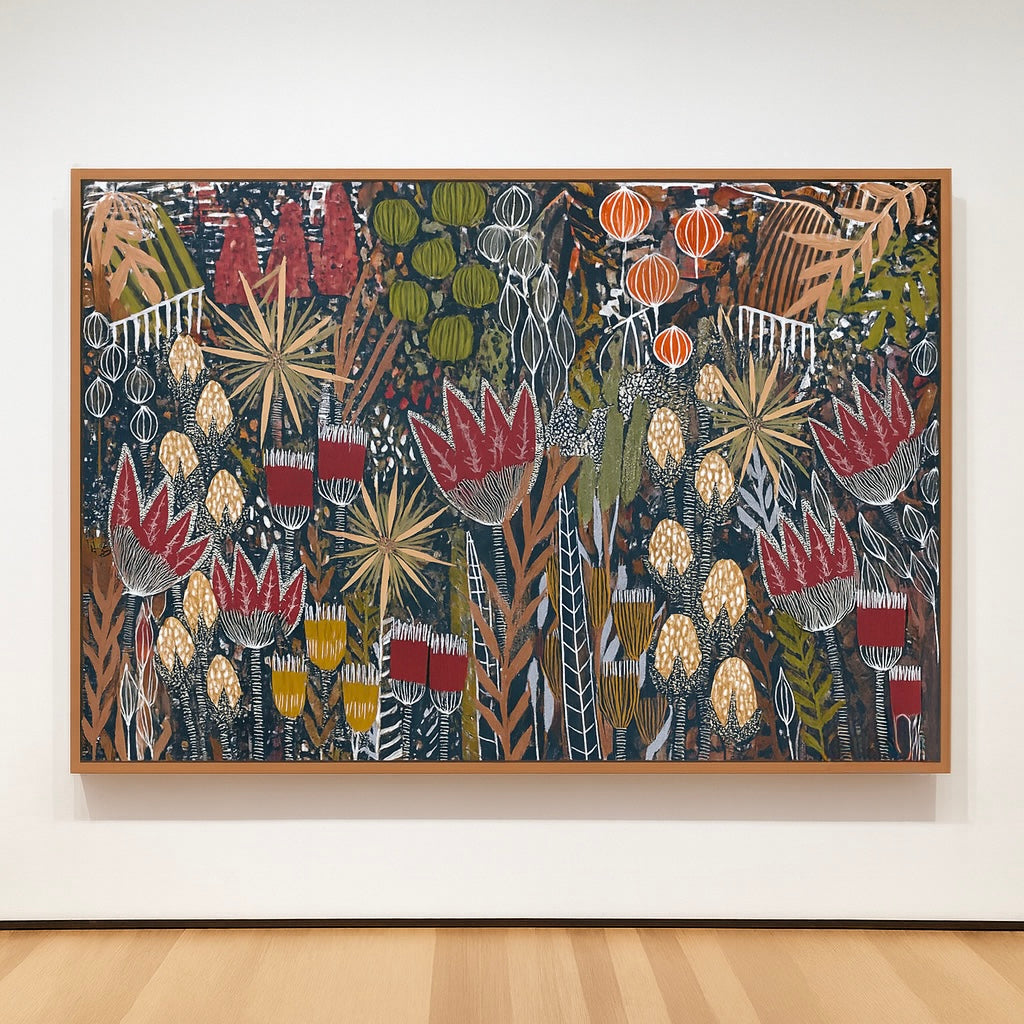 A rhythmic tapestry of untamed flora unfurls beneath a midnight sky, where bold crimson petals and golden starbursts echo the quiet symphony of nature after dusk. Layered with rich textures and intricate patterns, this artwork captures the mystery and beauty of a garden that blooms in dreams—wild, free, and ever-awake.